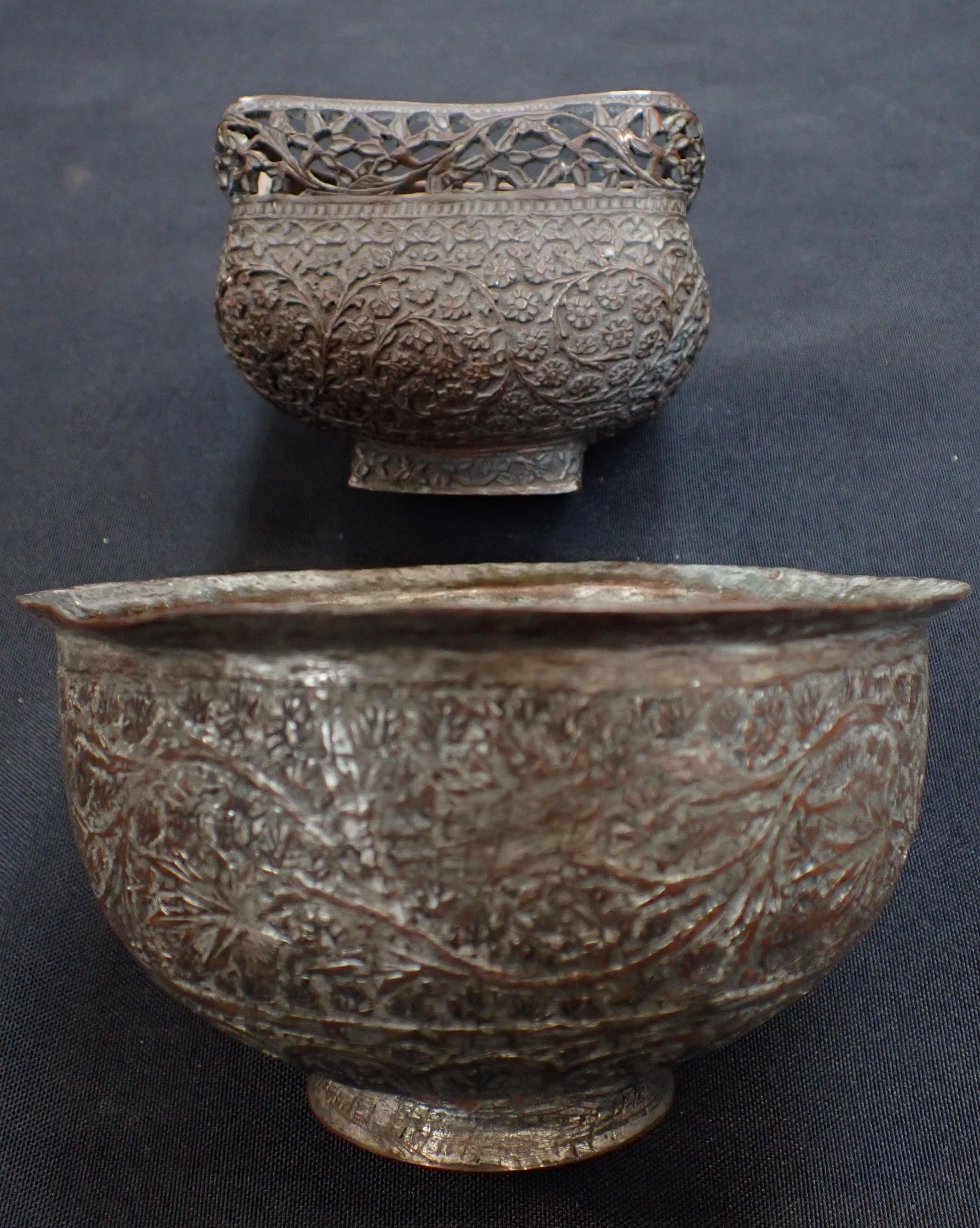 and pierced square rim, 10cm wide, and an Eastern circular bowl, 14cm dia (2)