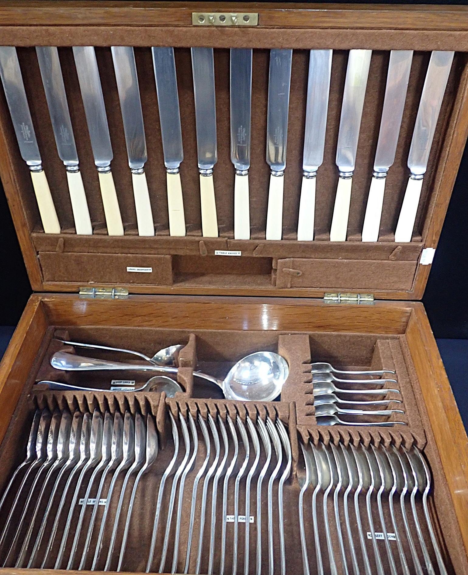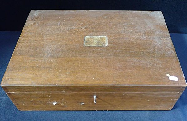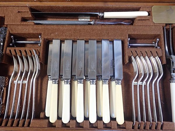 rat-tail pattern, the knives with ivorine handles (a few items missing, lid brass plate loose)