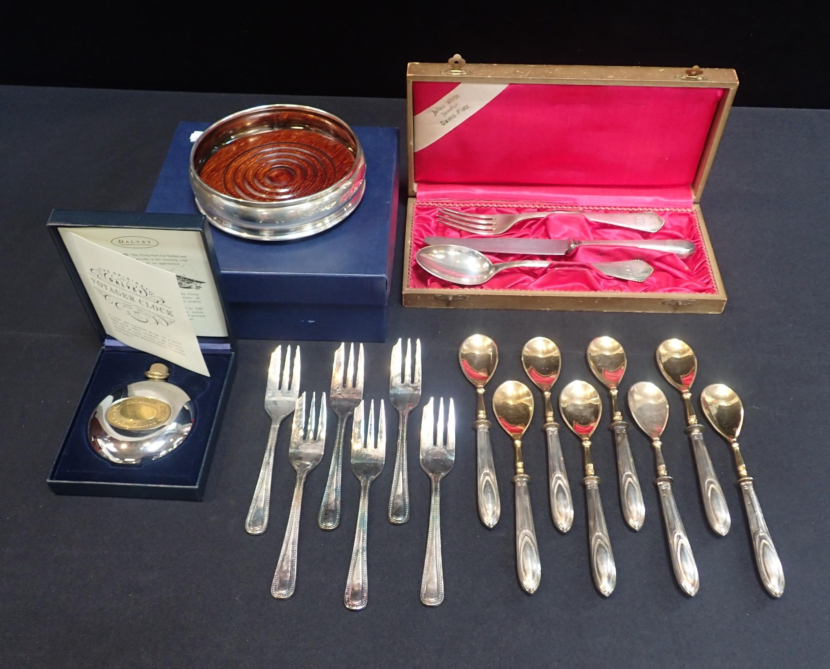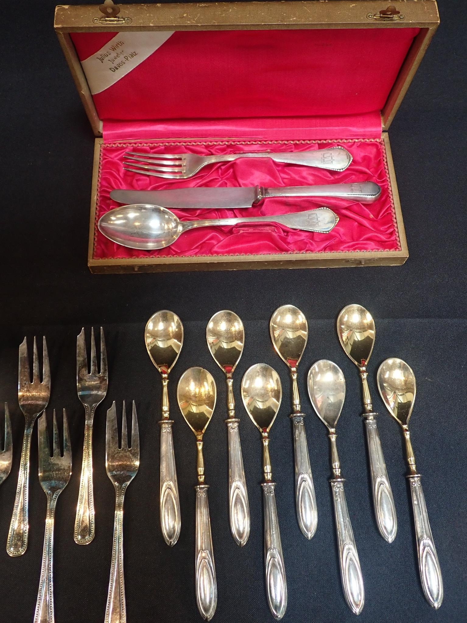 'IAN from Ian and Melba with our sincere gratitude', a silver knife, fork and spoon, cased a silver plated alarm clock and other plated flatware