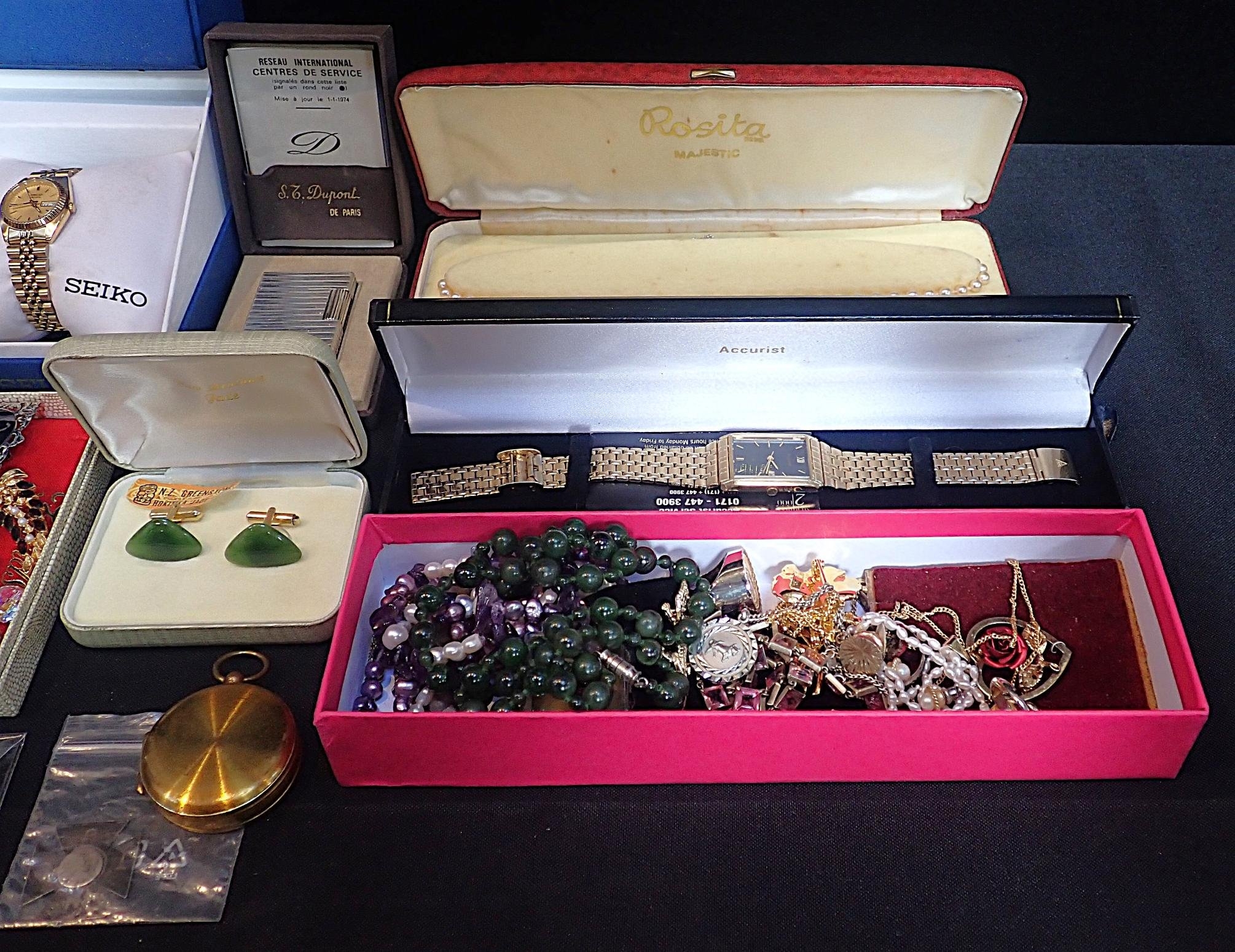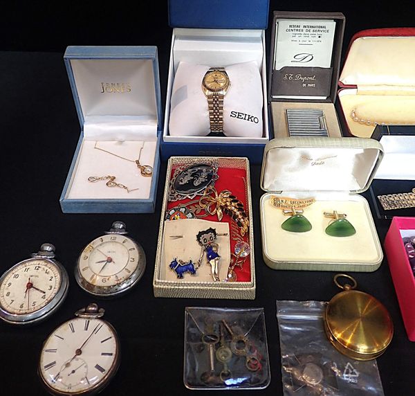 including brooches; pendant necklaces; rings; a Betty Boop and dog brooch; a Seiko watch; and a Dupont lighter (boxed)