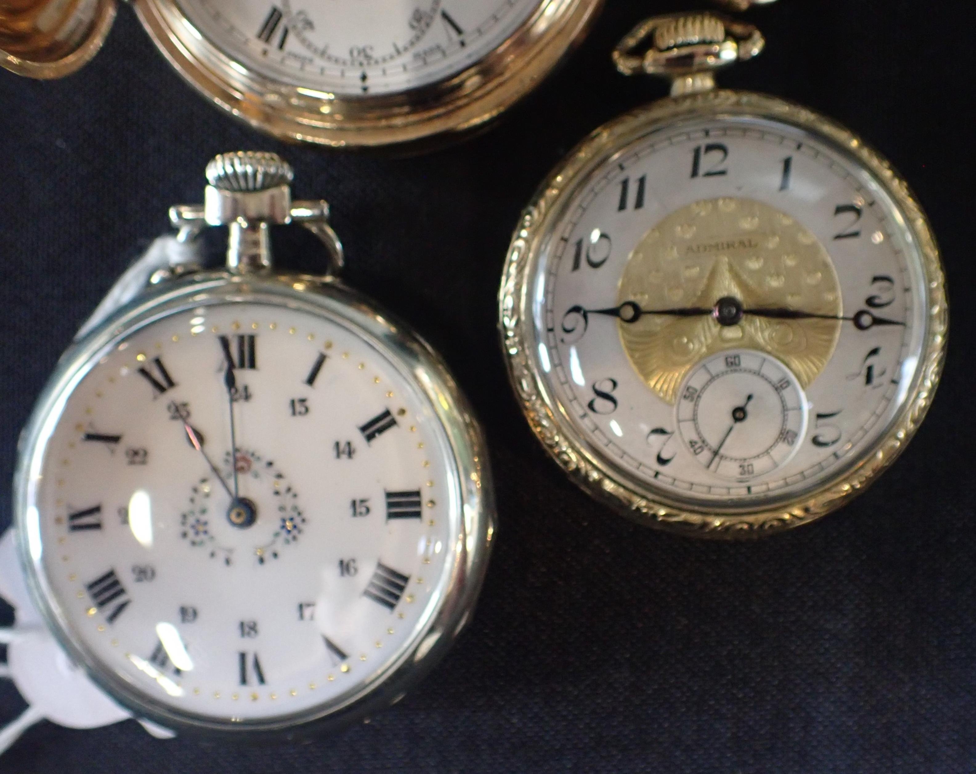 with key wind movement, white enamel dial, black roman numerals, subsidiary second dial and steel hands, with two other open face pocket watches (3)