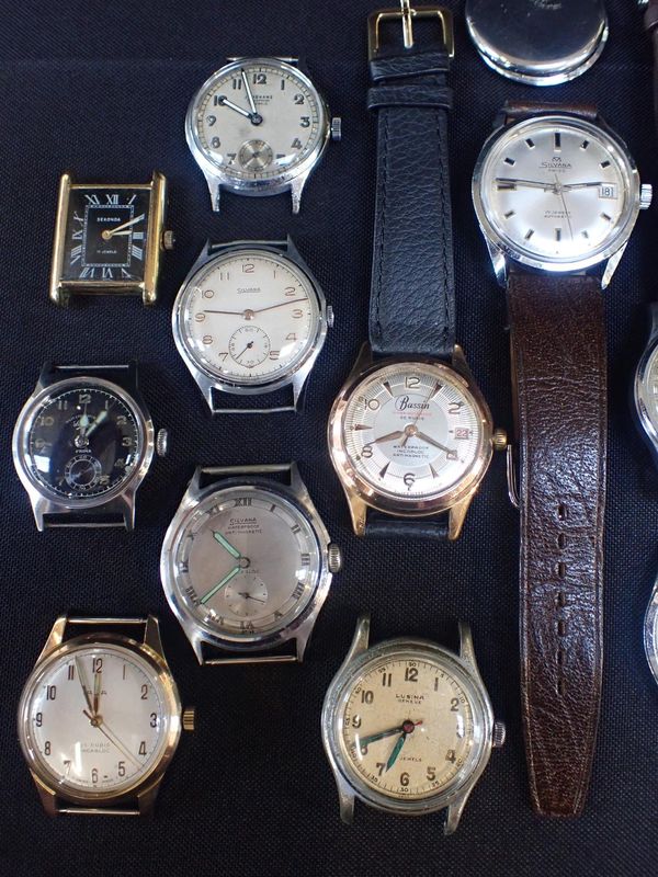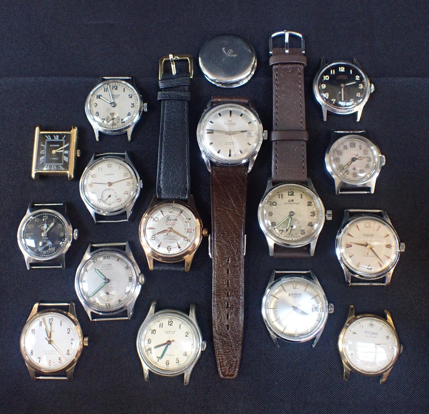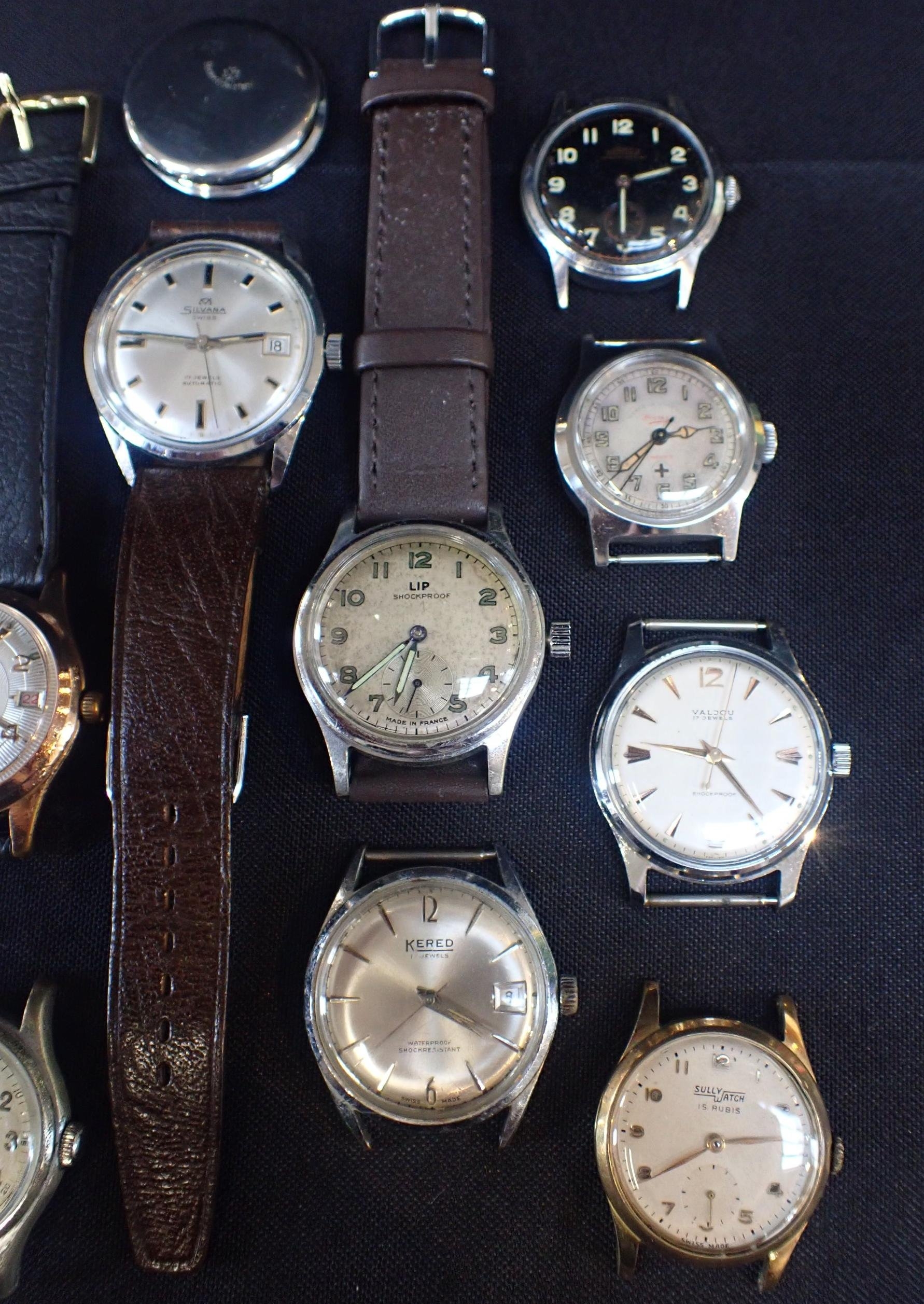 with manual wind movements, cream dial, black Arabic numerals and dark steel blue luminous hands, with a brown leather strap, and a quantity of various other gentlemens wrist watches