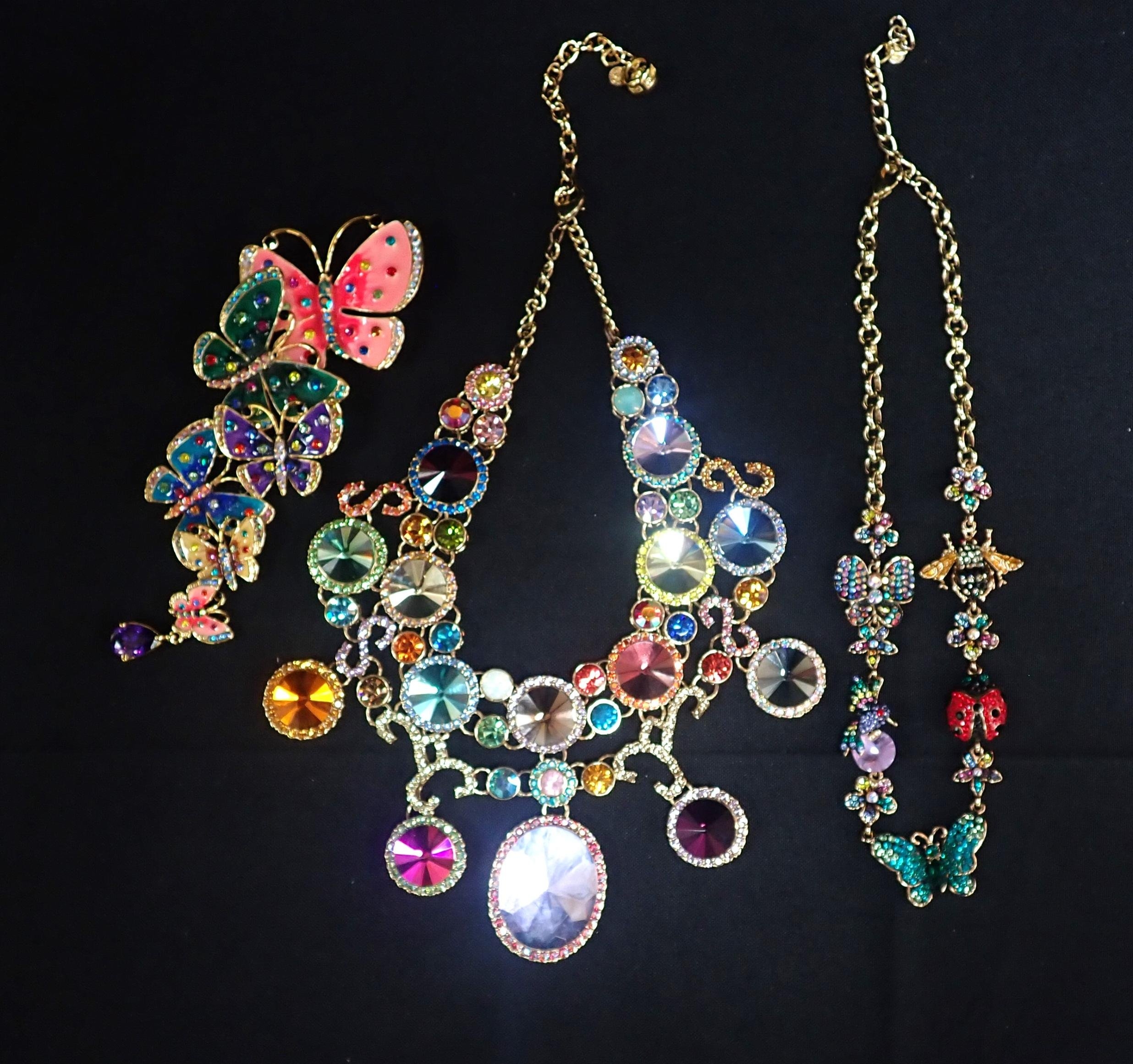 with large multicoloured faceted stones, an insect necklace, and a large B & W butterfly brooch, all in one B & W box (3)