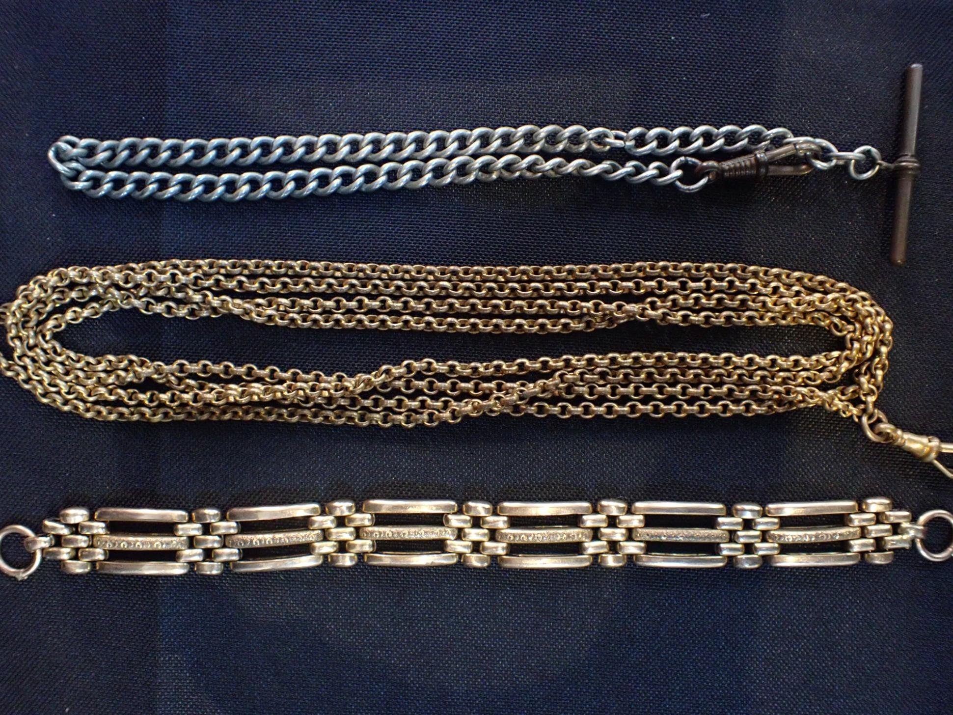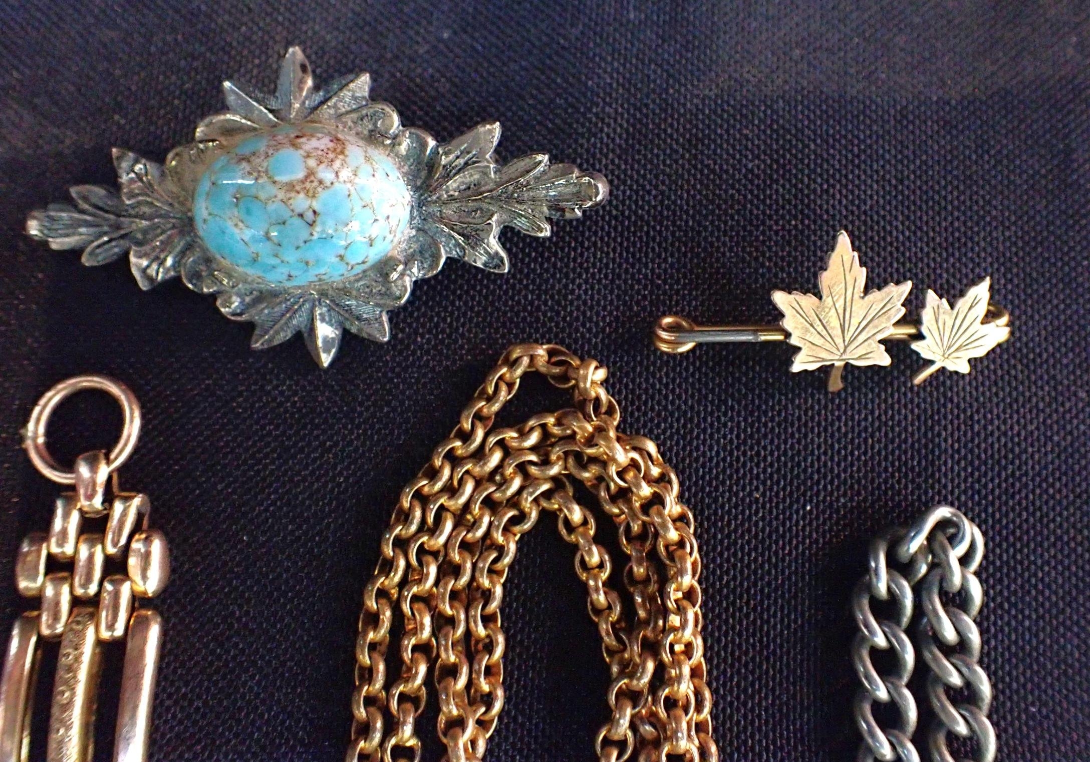 including a gatelink bracelet; a maple leaf brooch; a guard chain with dog clip; a blue stone brooch (no pin); a white metal curb link chain with T-bar and dog clip, (5)