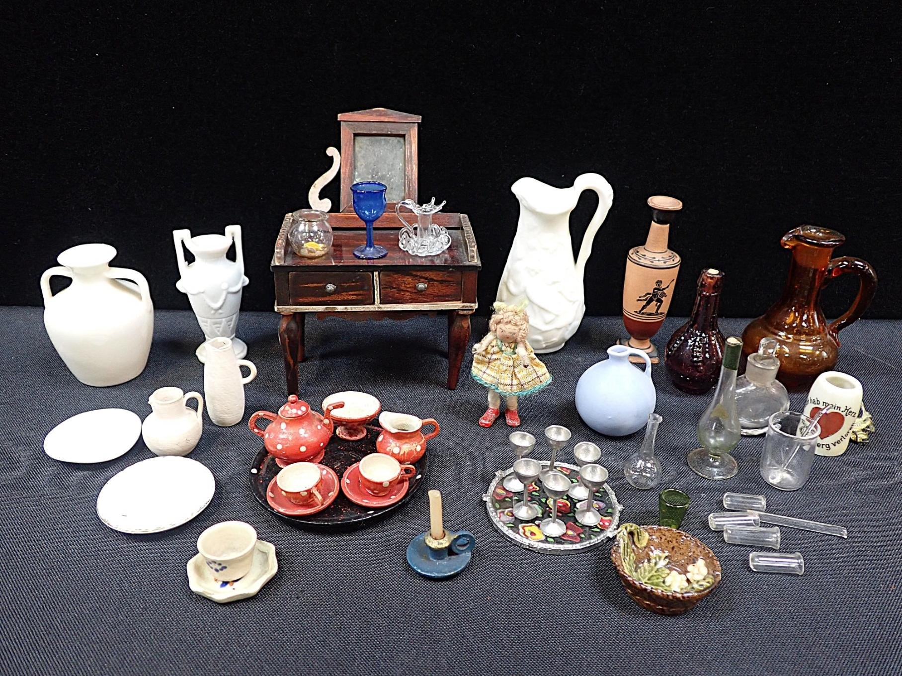 a collection including a  Waltershausen type dressing table (a/f), a turned wooden tea set, glassware, metal goblets on tray, bisque jugs, etc