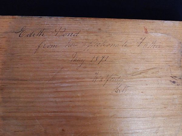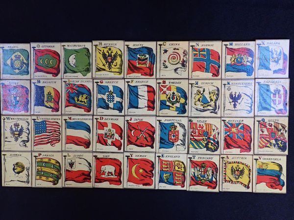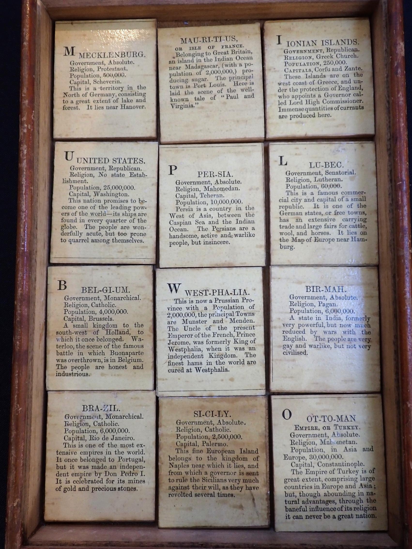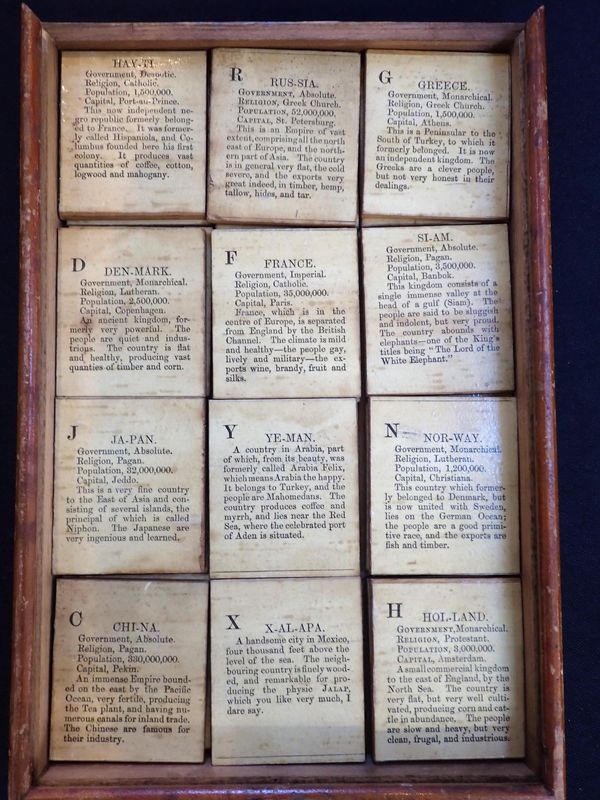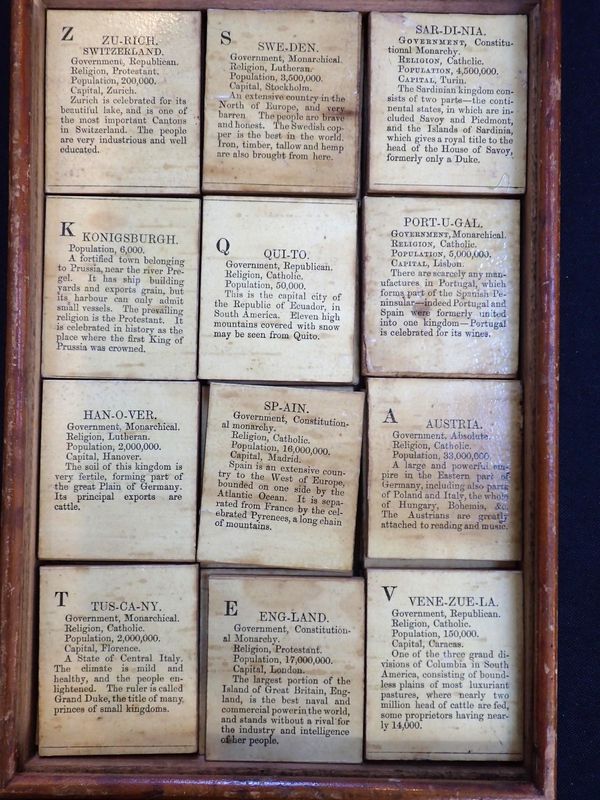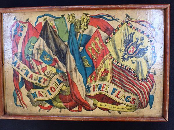 mid-19th century juvenile educational toy, 36 chromolithographed wooden 'tiles' depicting flags with explanatory text, in wooden box with chromolithographed lid, with presentation inscription to underside of box dated 1871, possibly by E. Wallis, Islington (tiles and box only; lacks printed instructions or map)