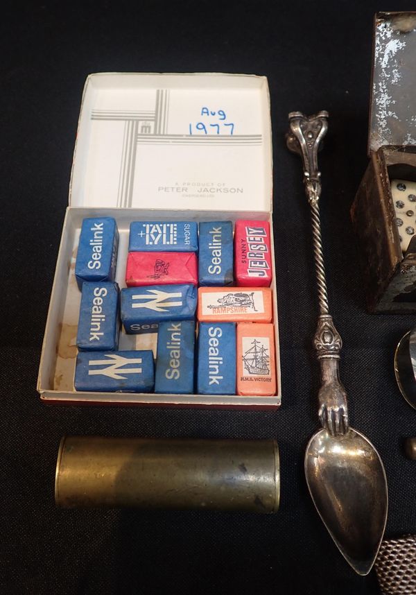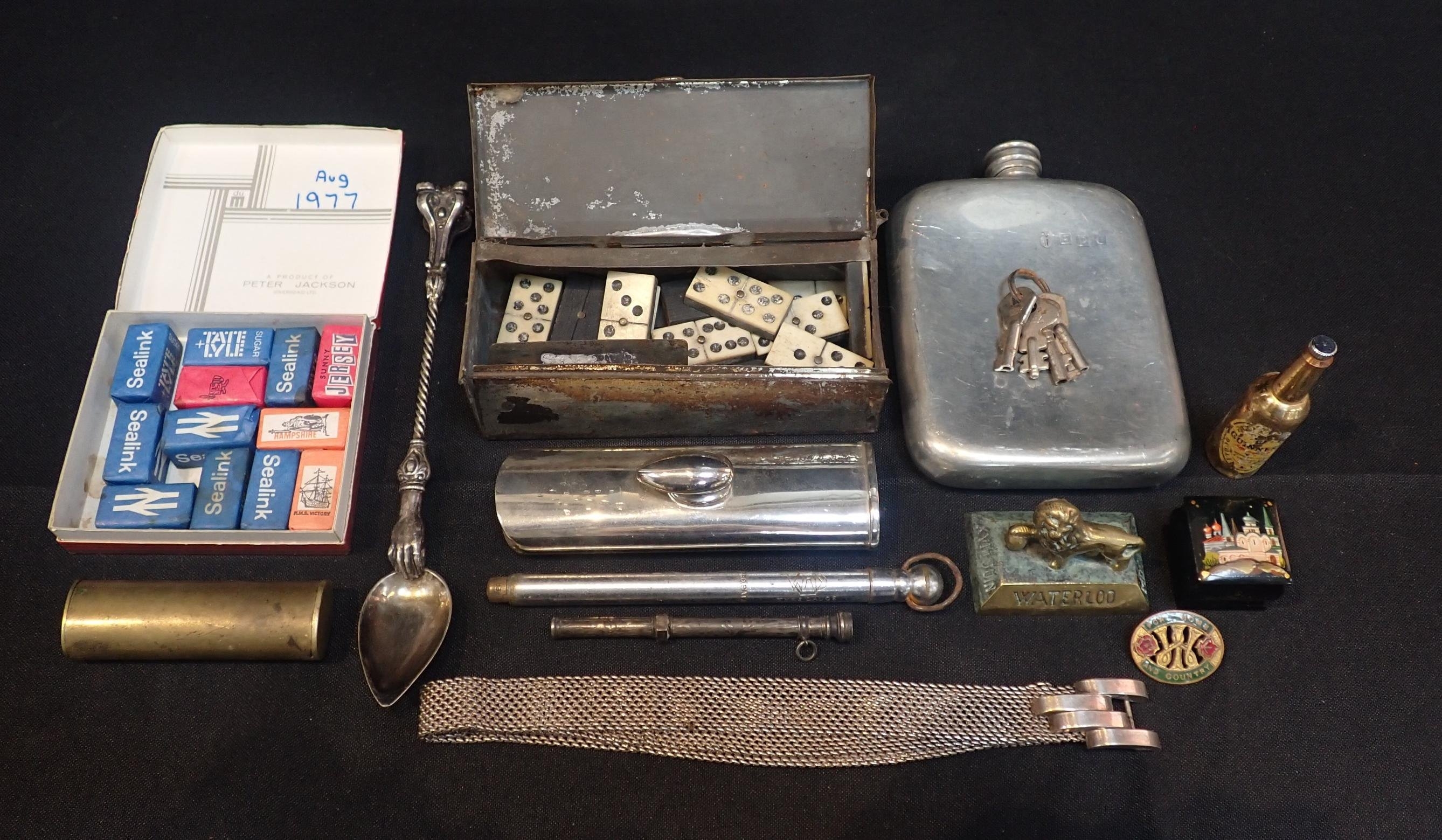 with other item including WW1 domino set, apothecary spoon, nurses white metal belt, pewter hip flask and other sundries