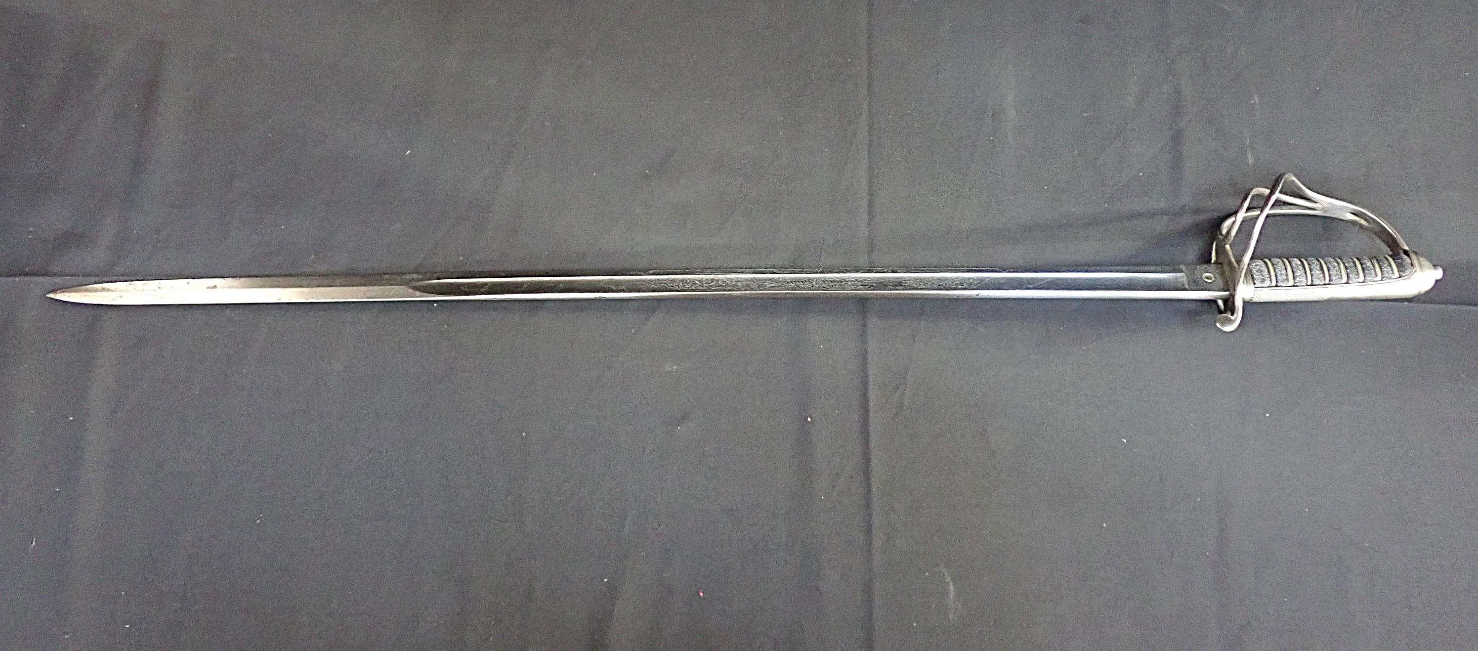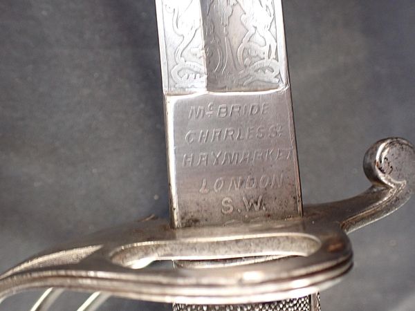 with engraved blade, by McBride, Charles St, Haymarket, London S.W. (no scabbard), 103cm overall