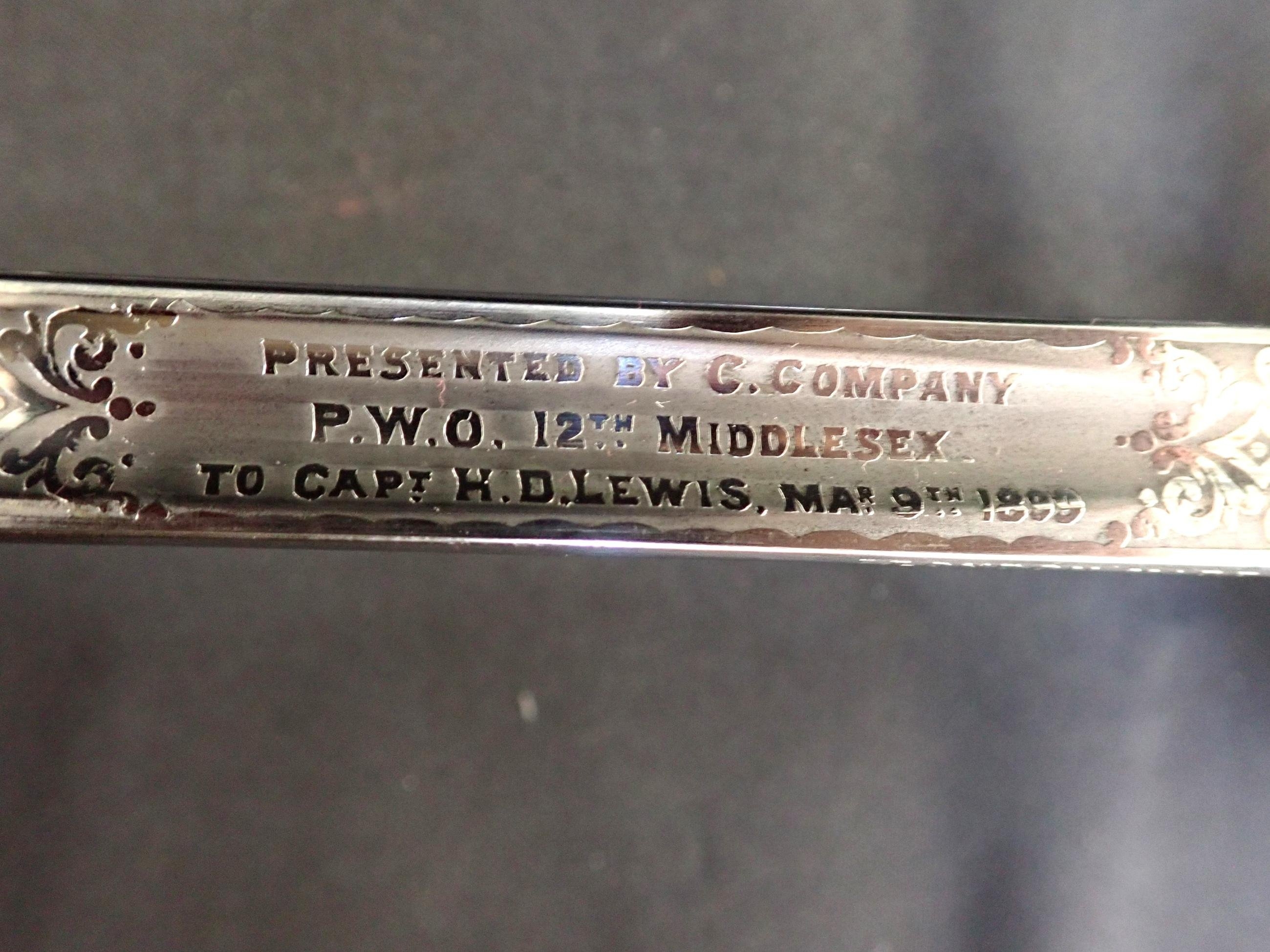 presented by C. Company P.W.O. 12th Middlesex to Capt. H.D. Lewis, Mar. 9th 1899, in scabbard, 101cm overall (some pitting to guard)