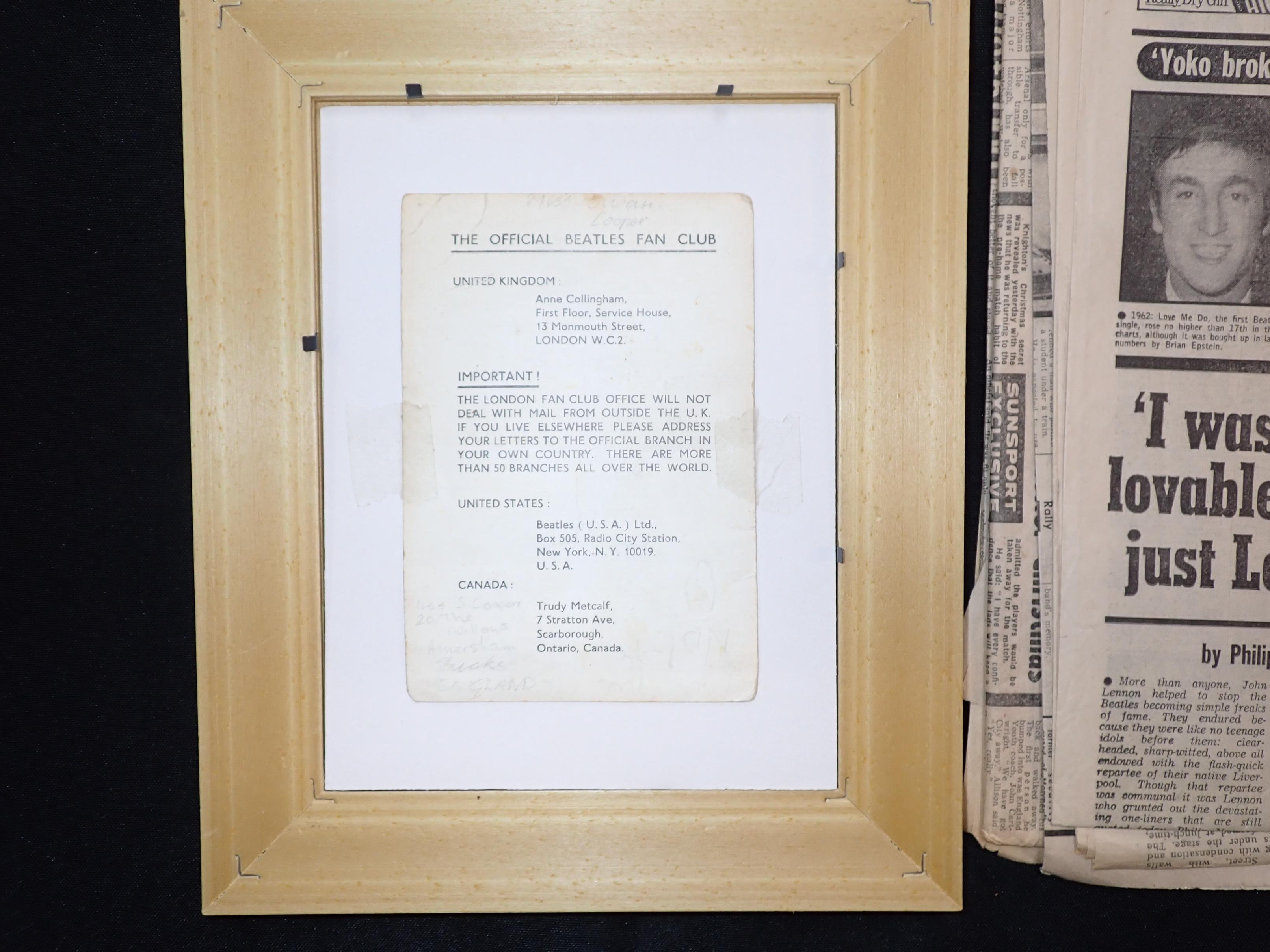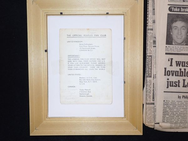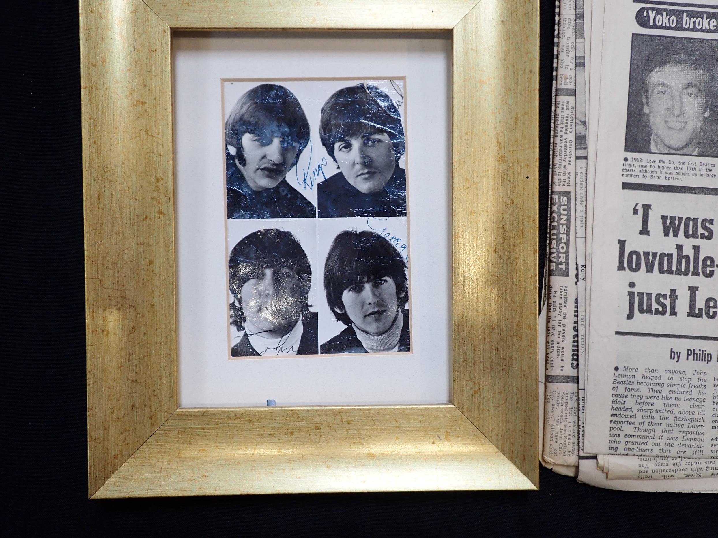 bearing signatures possibly printed (unauthenticated; creased, tear), with  newspapers from the time of John Lennon's death, and two Beatles books; 'The Beatles Anthology' and 'Imagine John Yoko'