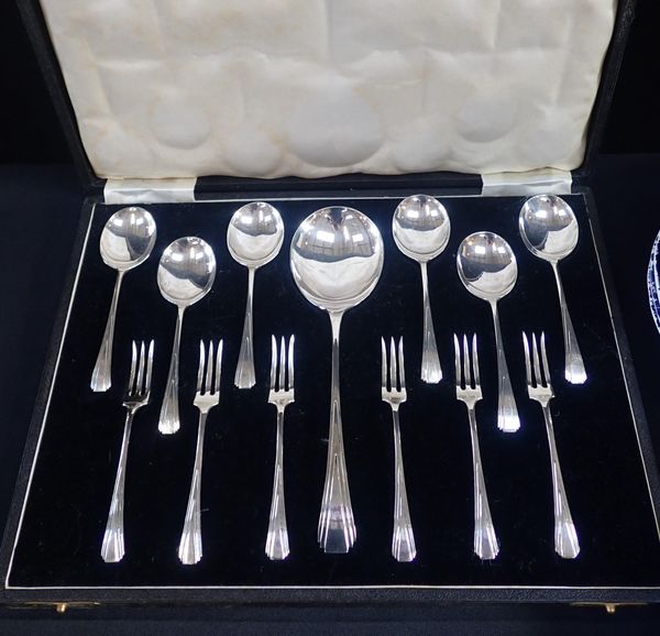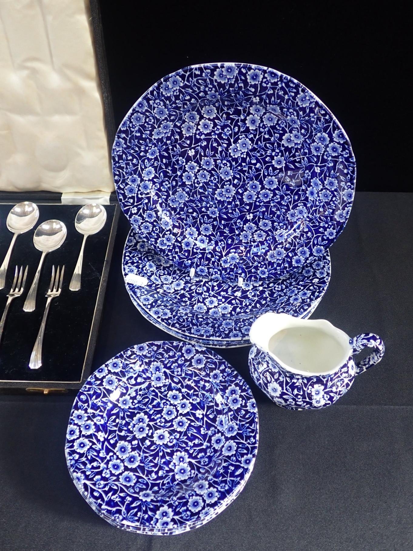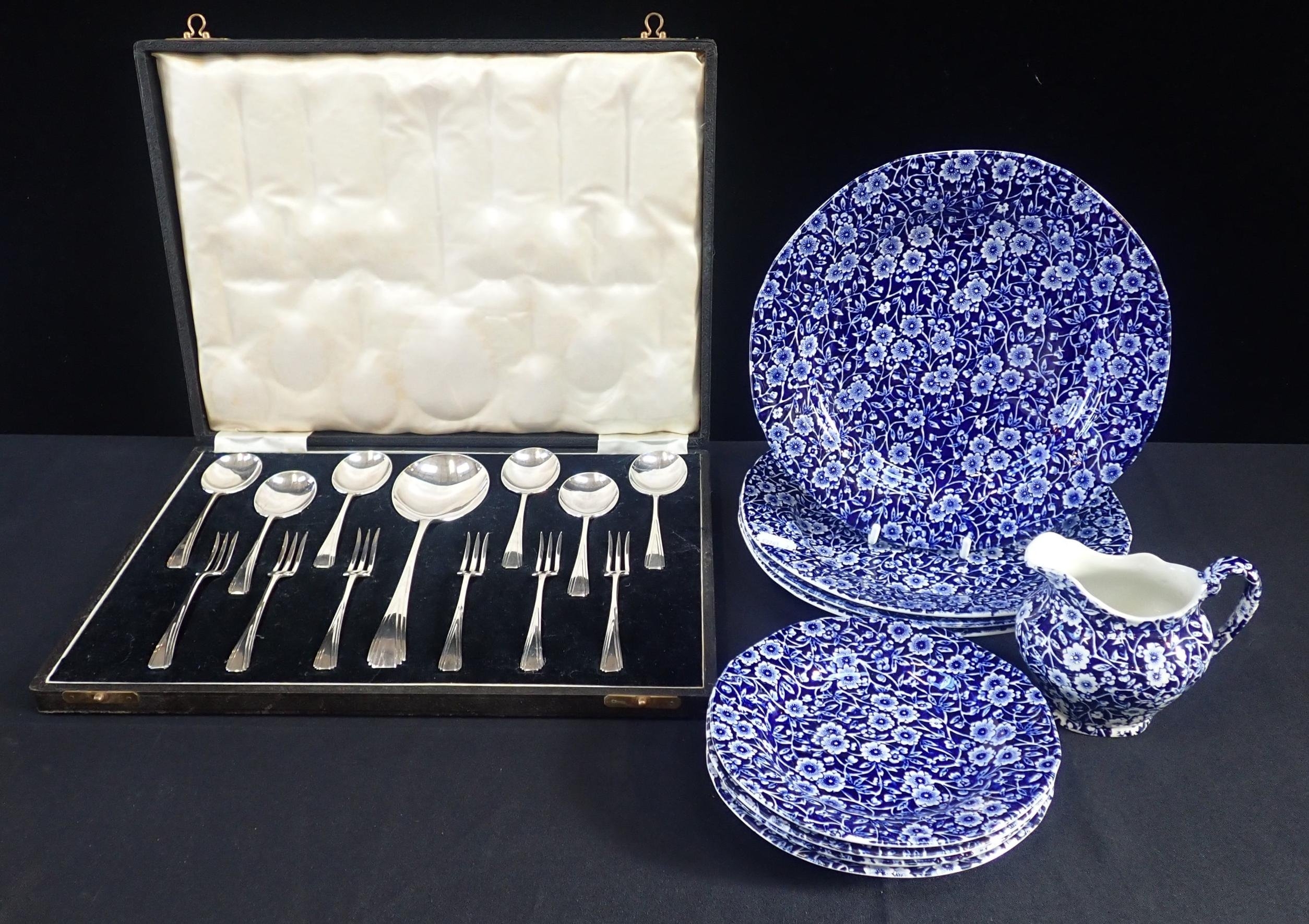 four teaplates, four dinner plates and a jug with a cased set of plated spoons