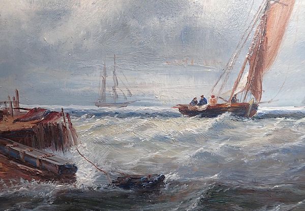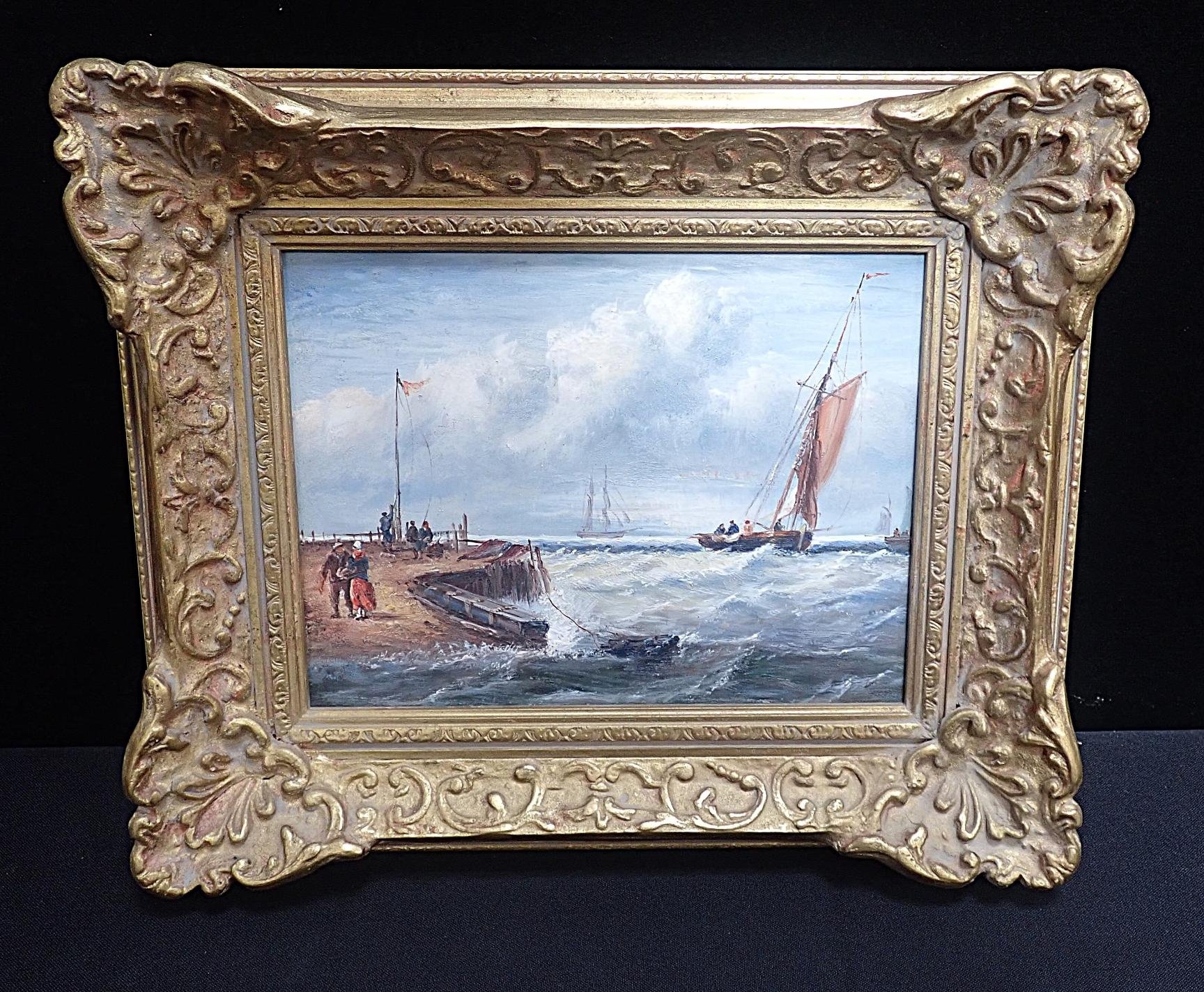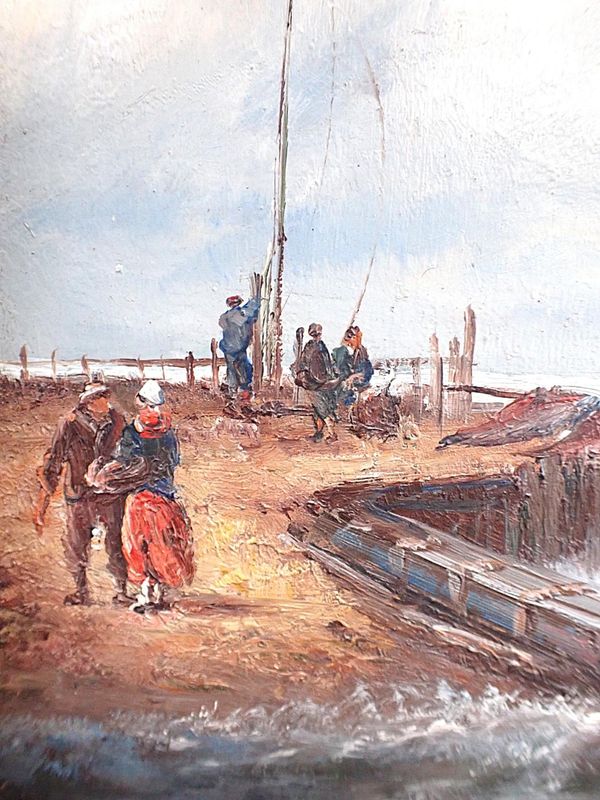 coastal scene, with figures to the shore, oil on board, in a gilt frame, 27 x 32cm