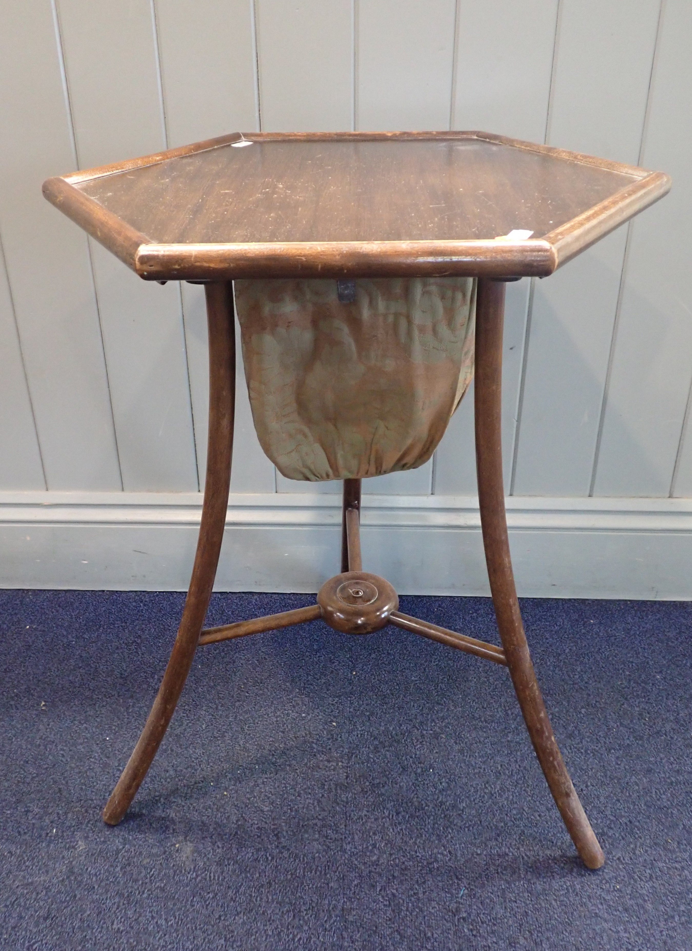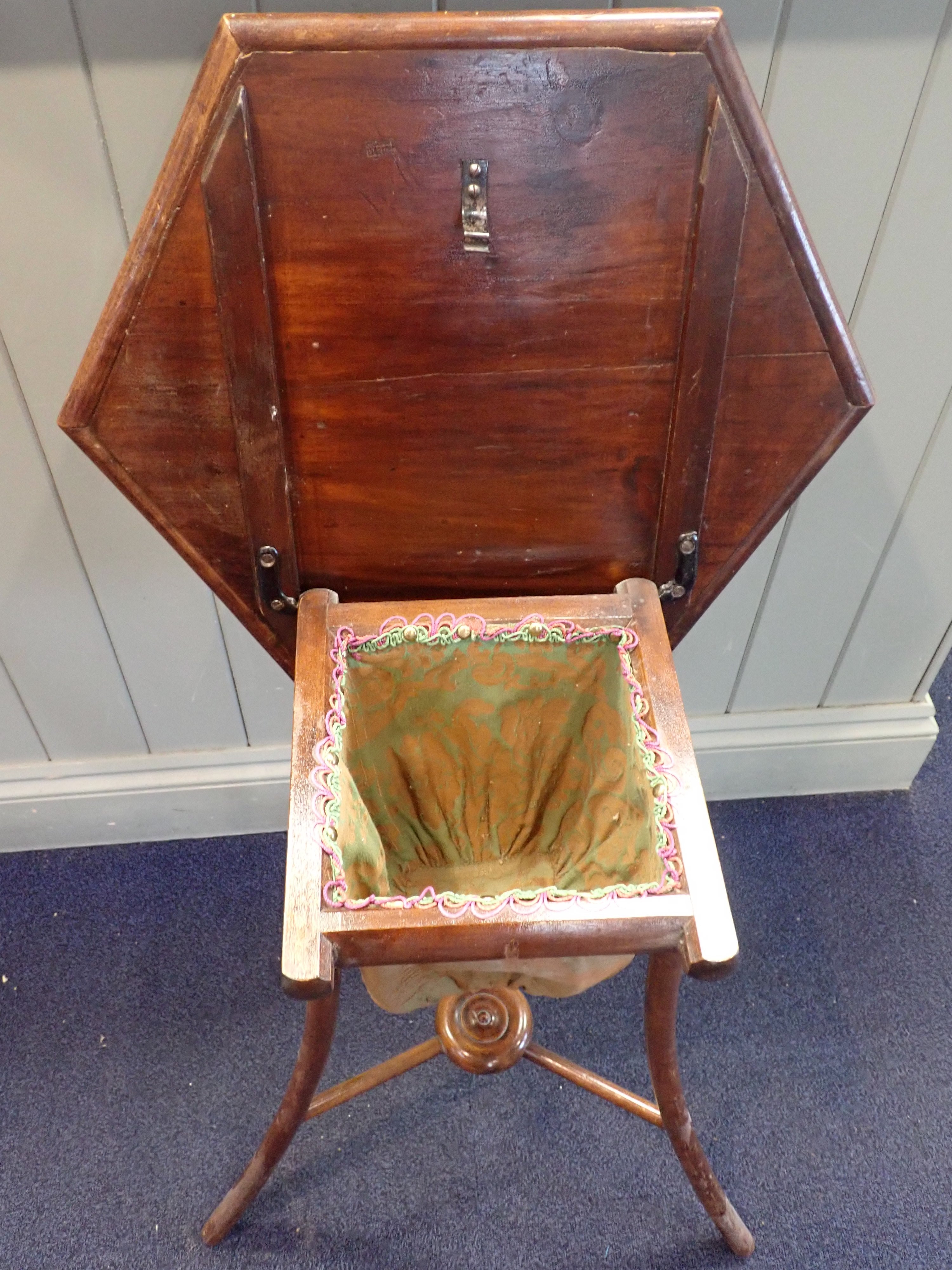 and hinged octagonal top with bag under, the stretchers joined by a turned boss, stamped FIELD, Birmingham, 48cm wide