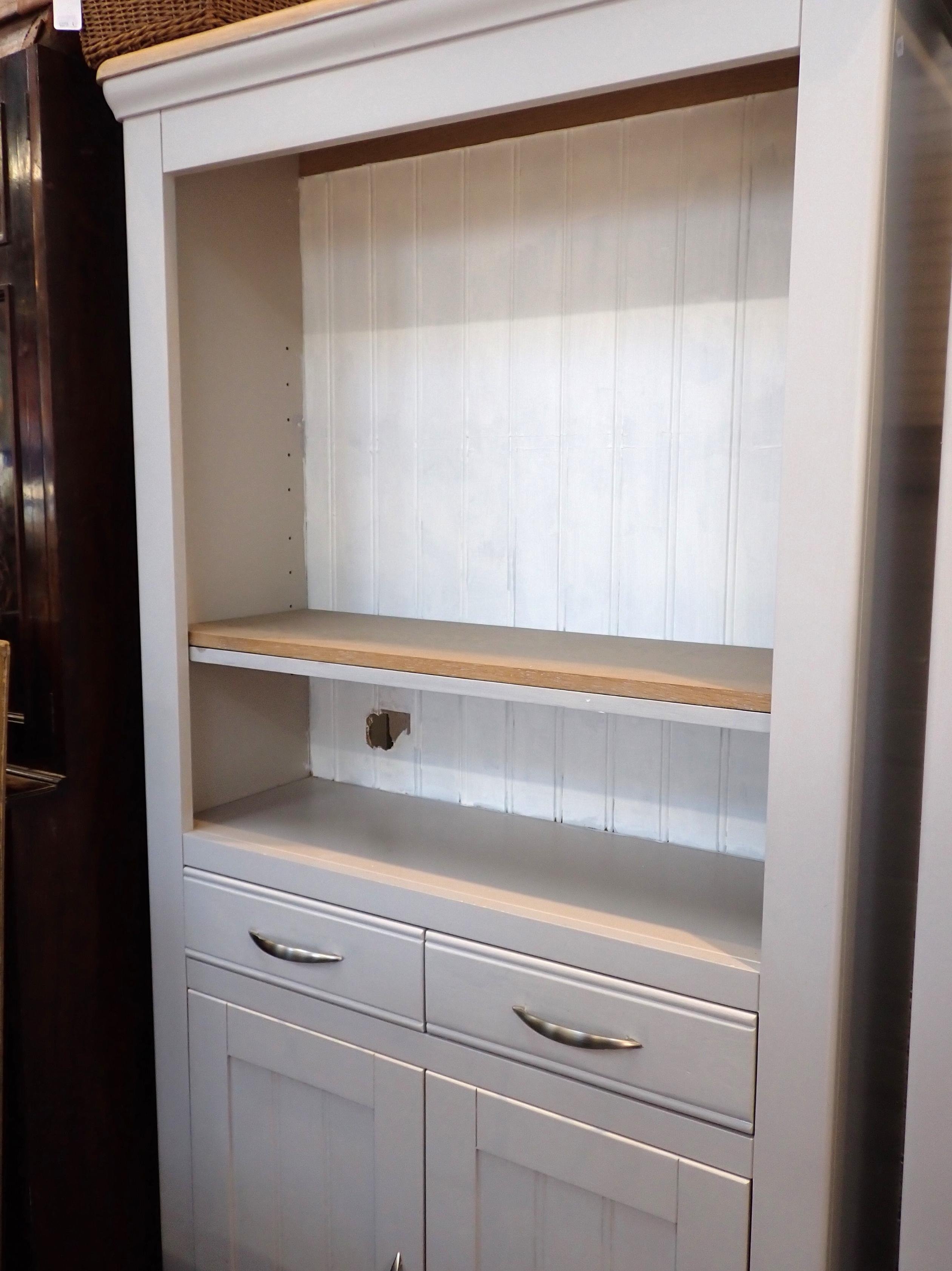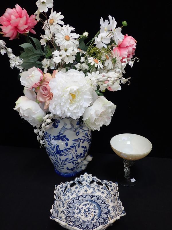 with open shelves over drawers and cupboards, 191cm high, 95cm wide, 35cm deep, with a blue and white vase of artificial flowers (a/f), a Portugese dish, and a glass comport (5)