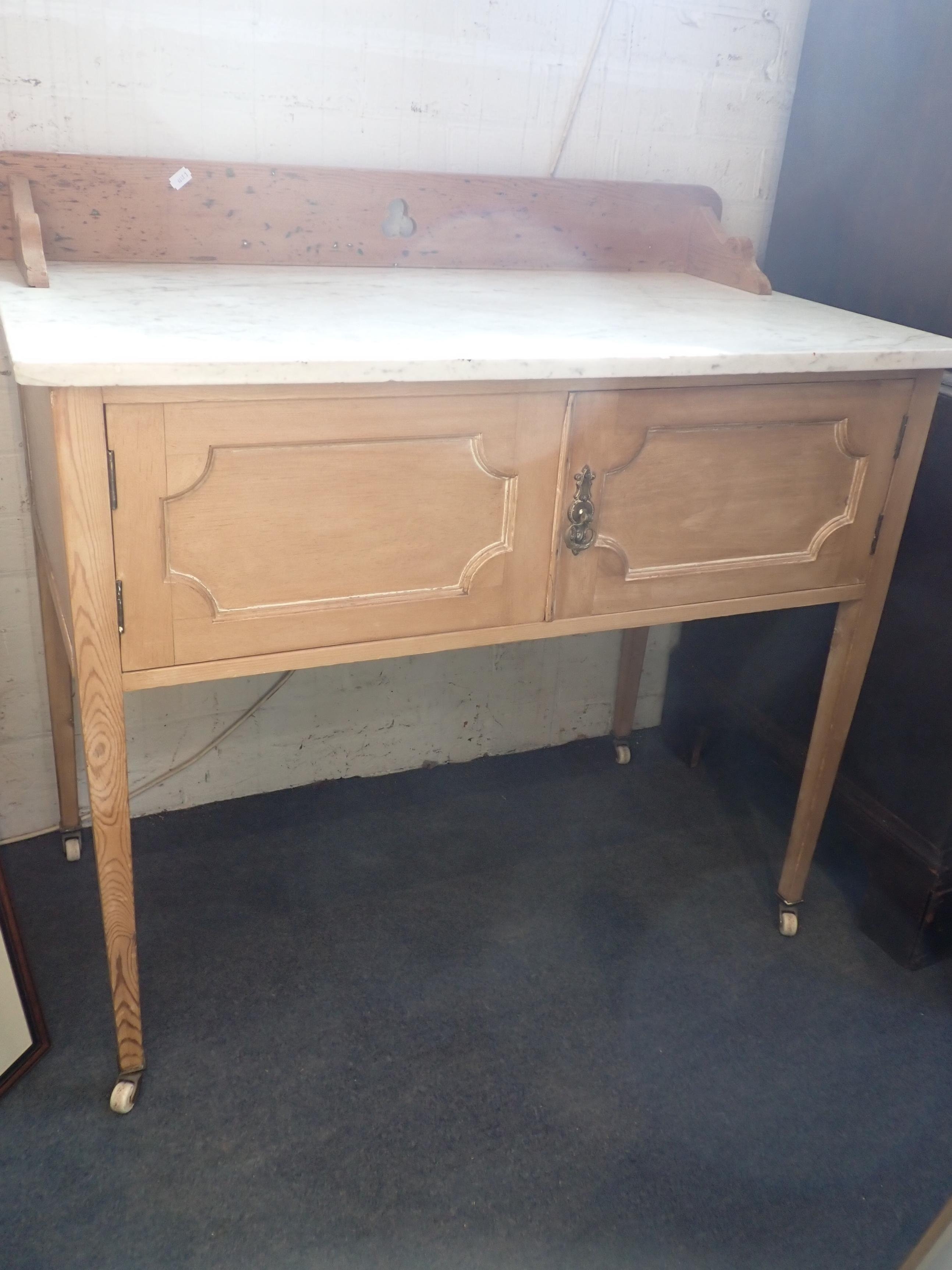 stripped, on square tapering legs, with white marble top, 92cm wide