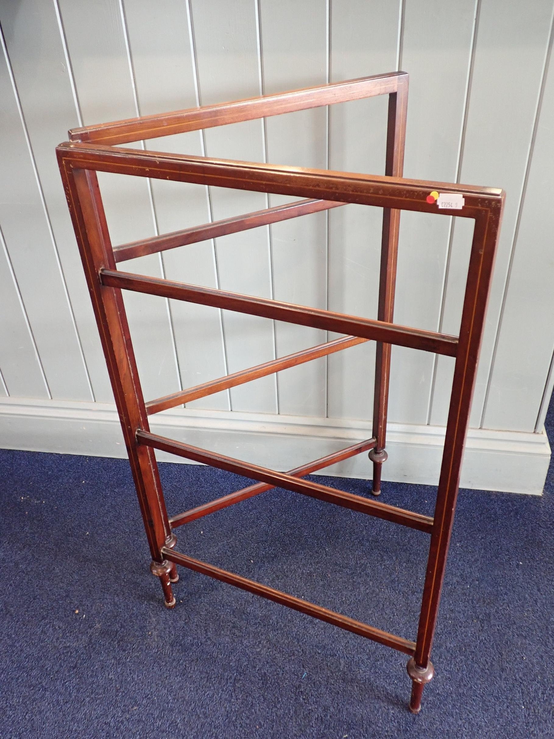 AN EDWARDIAN LINE-INLAID MAHOGANY FOLDING TOWEL RAIL
