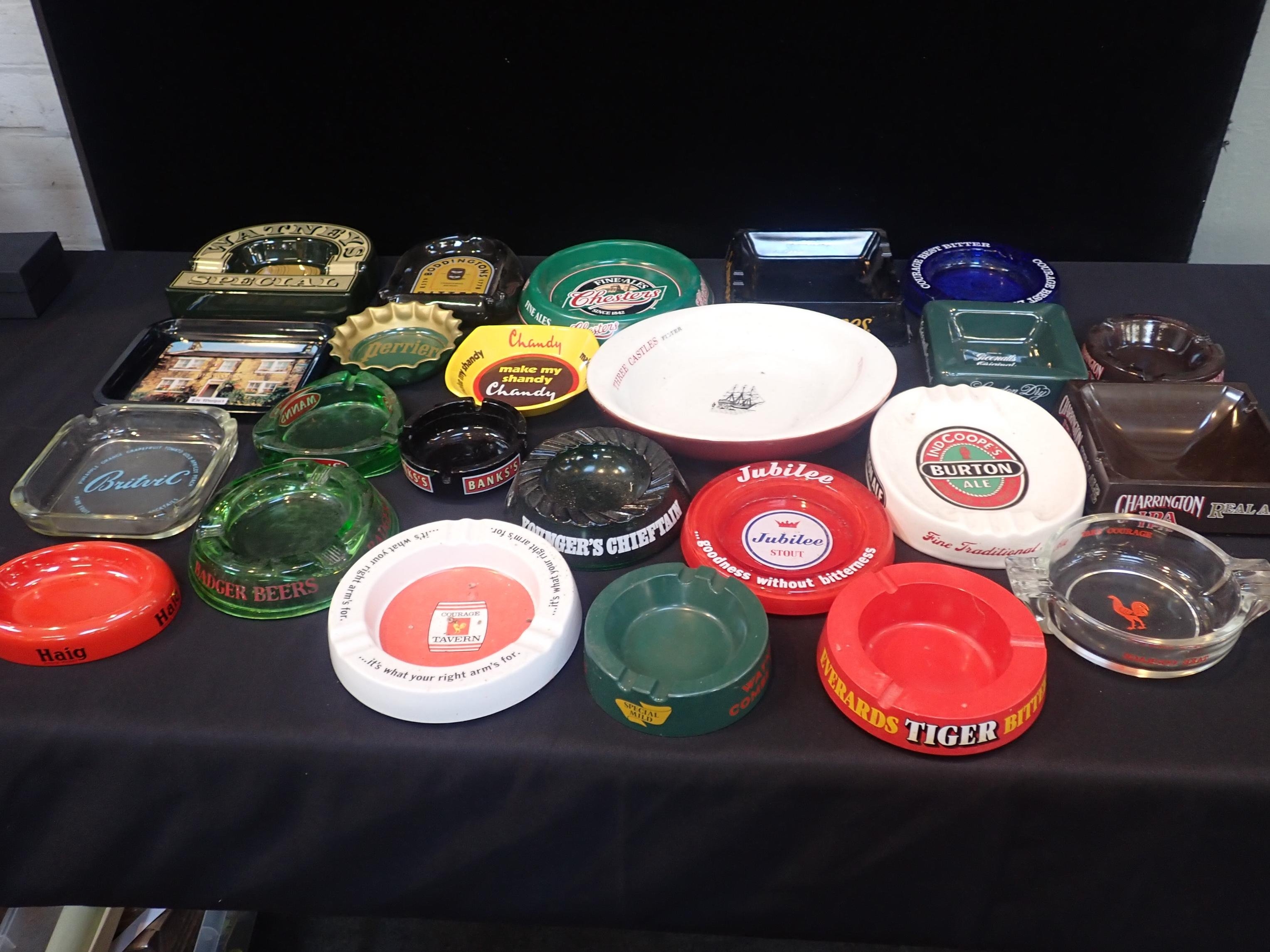Ceramic, glass and plastic ash trays, including; 'Bank's', 'Perrier', Schweppes' and 'Haig'. (25)