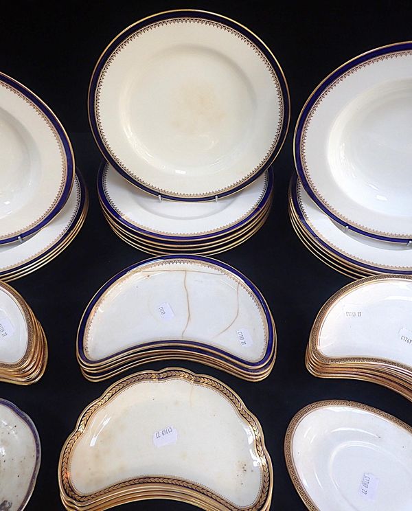 and soup plates, with blue and gilt rims, and other similar ware (some damage)