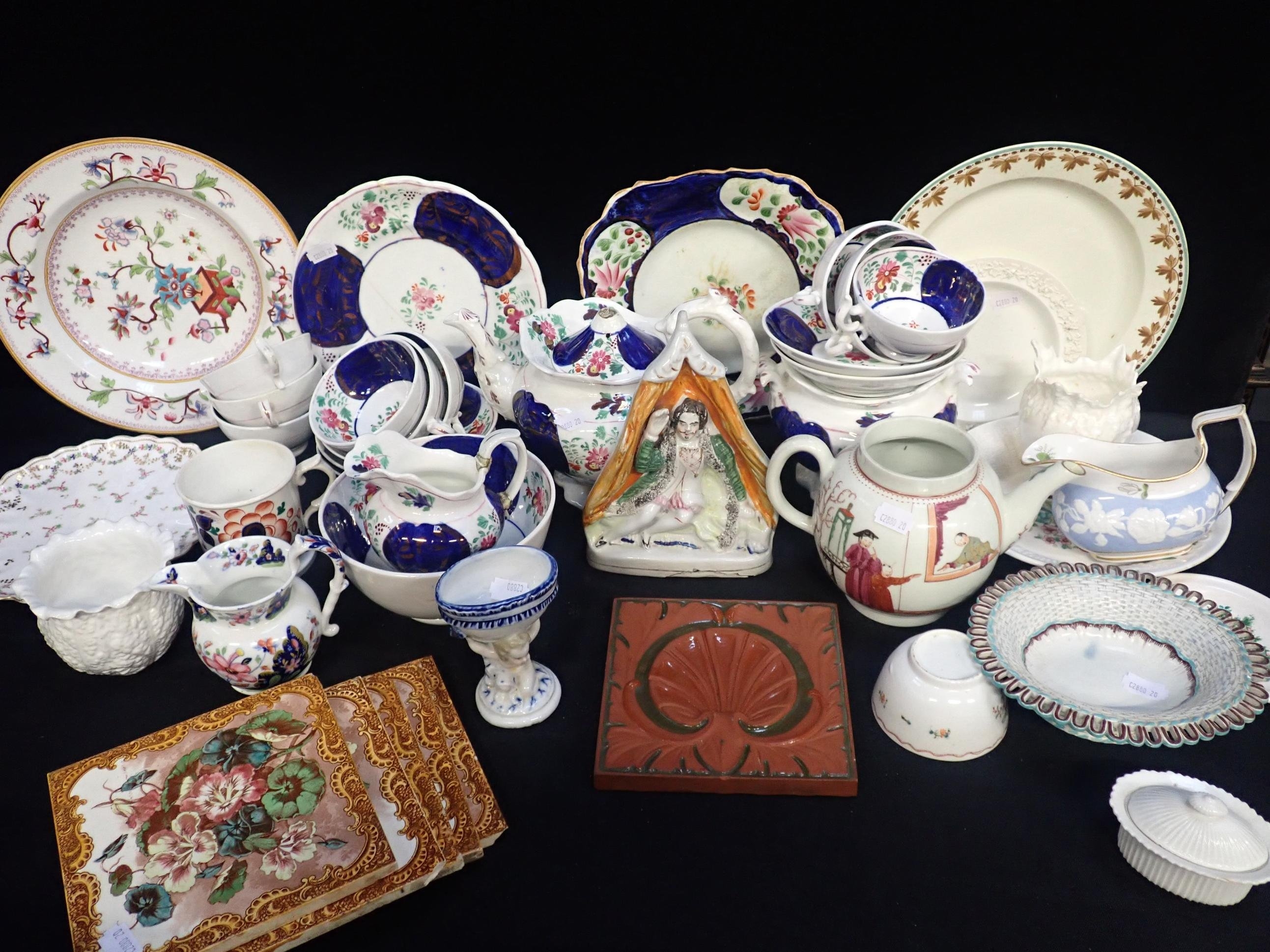 including a (damaged) Staffordshire Garrick figure, a Maw's tile, gaudy Welsh tea ware, etc