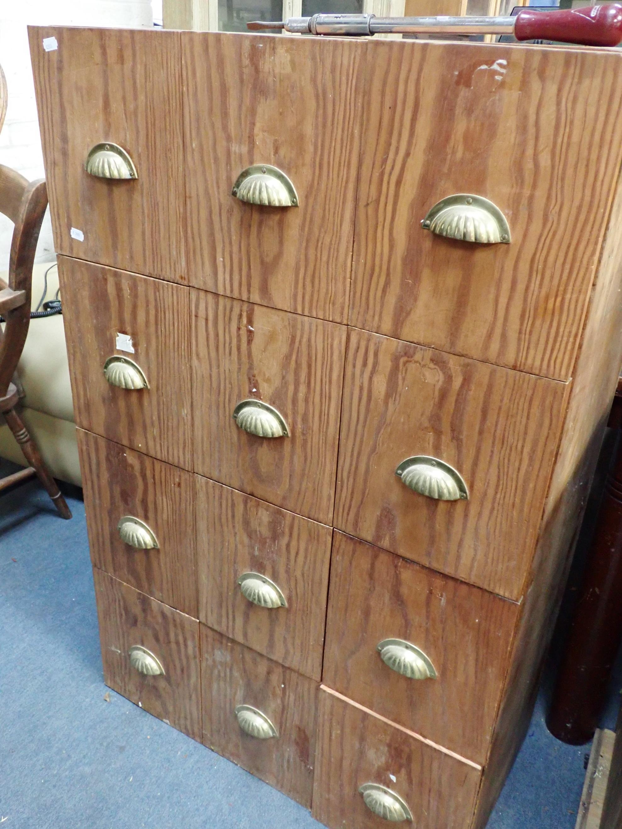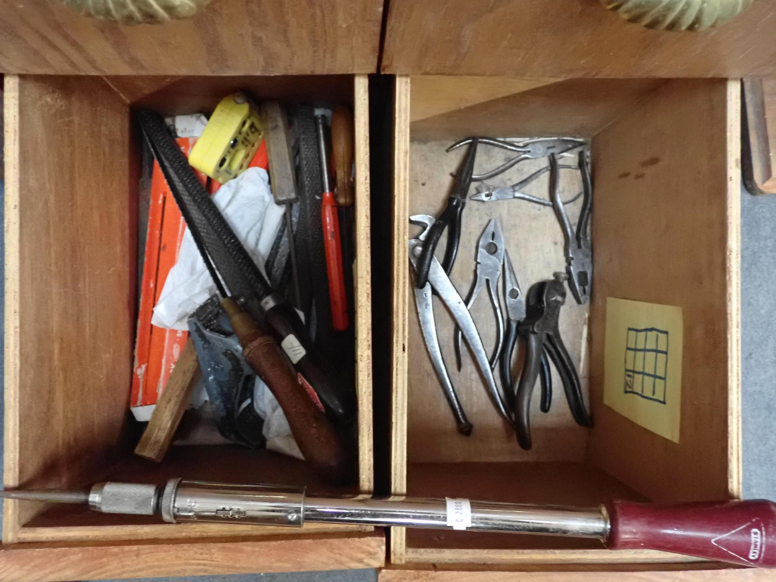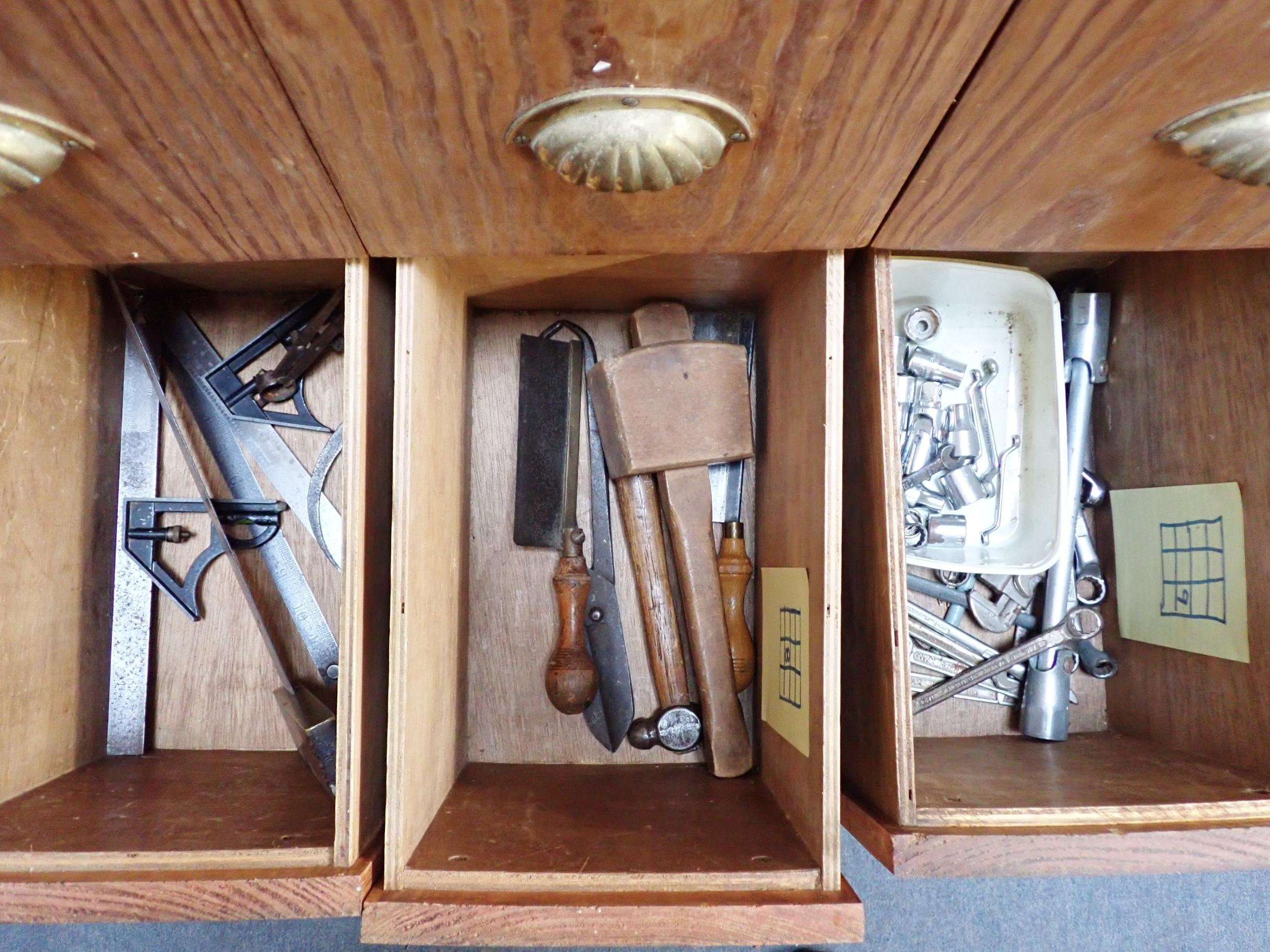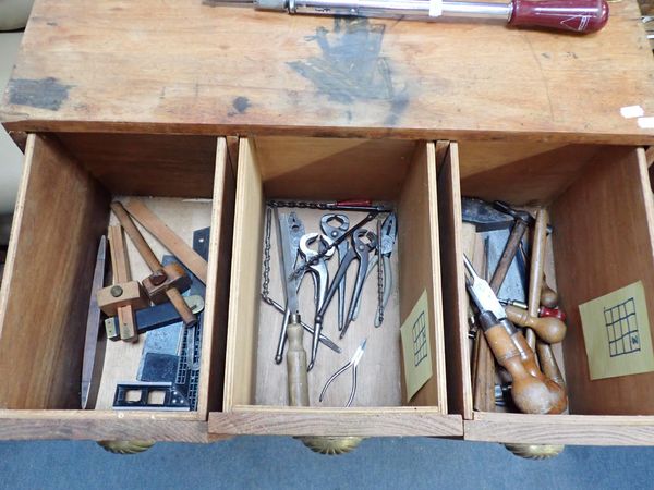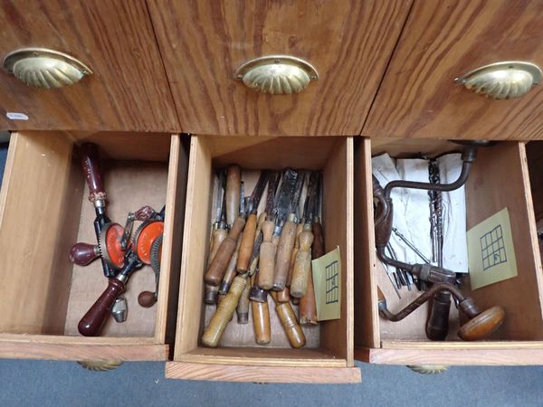 hisels, drills, braces, spanners, squares, etc, contained in a home-made tool chest with pitch pine drawer fronts and brass handles, 119cm high, 76cm wide, 38cm deep
