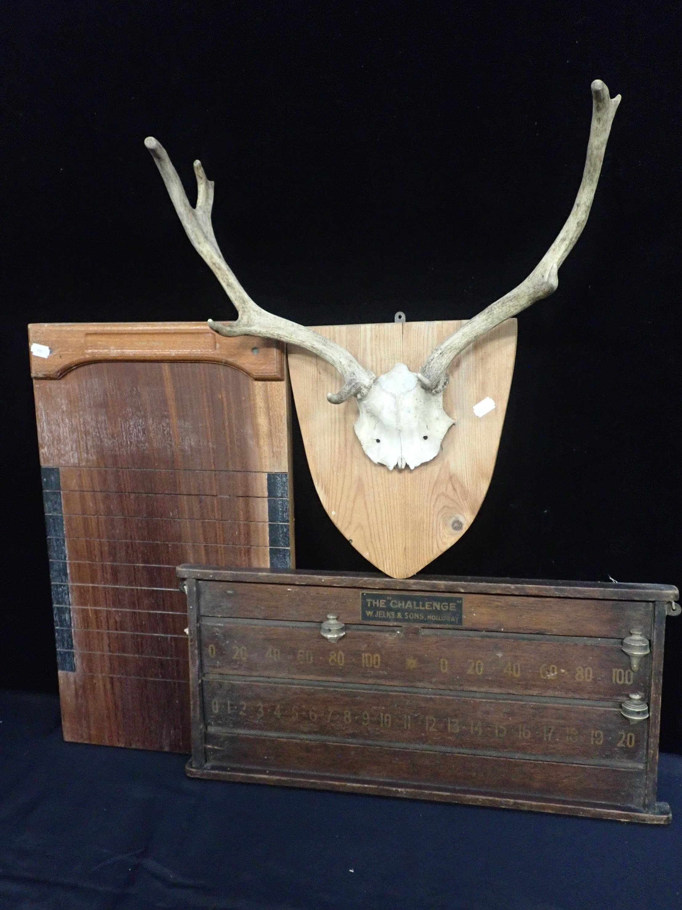 46cm wide, a shove ha'penny board, and a W. Jelks & Sons billiards scoreboard (3)