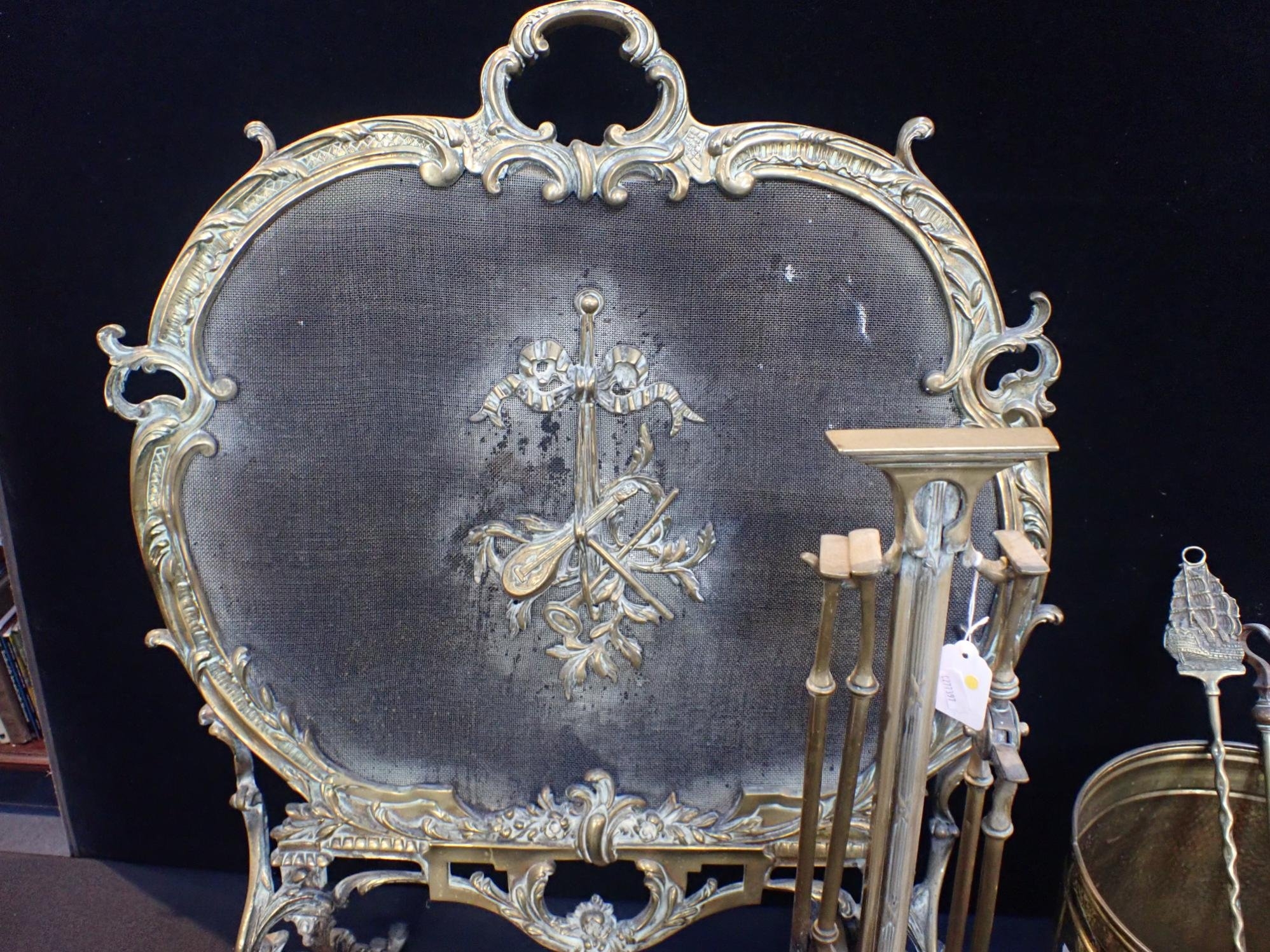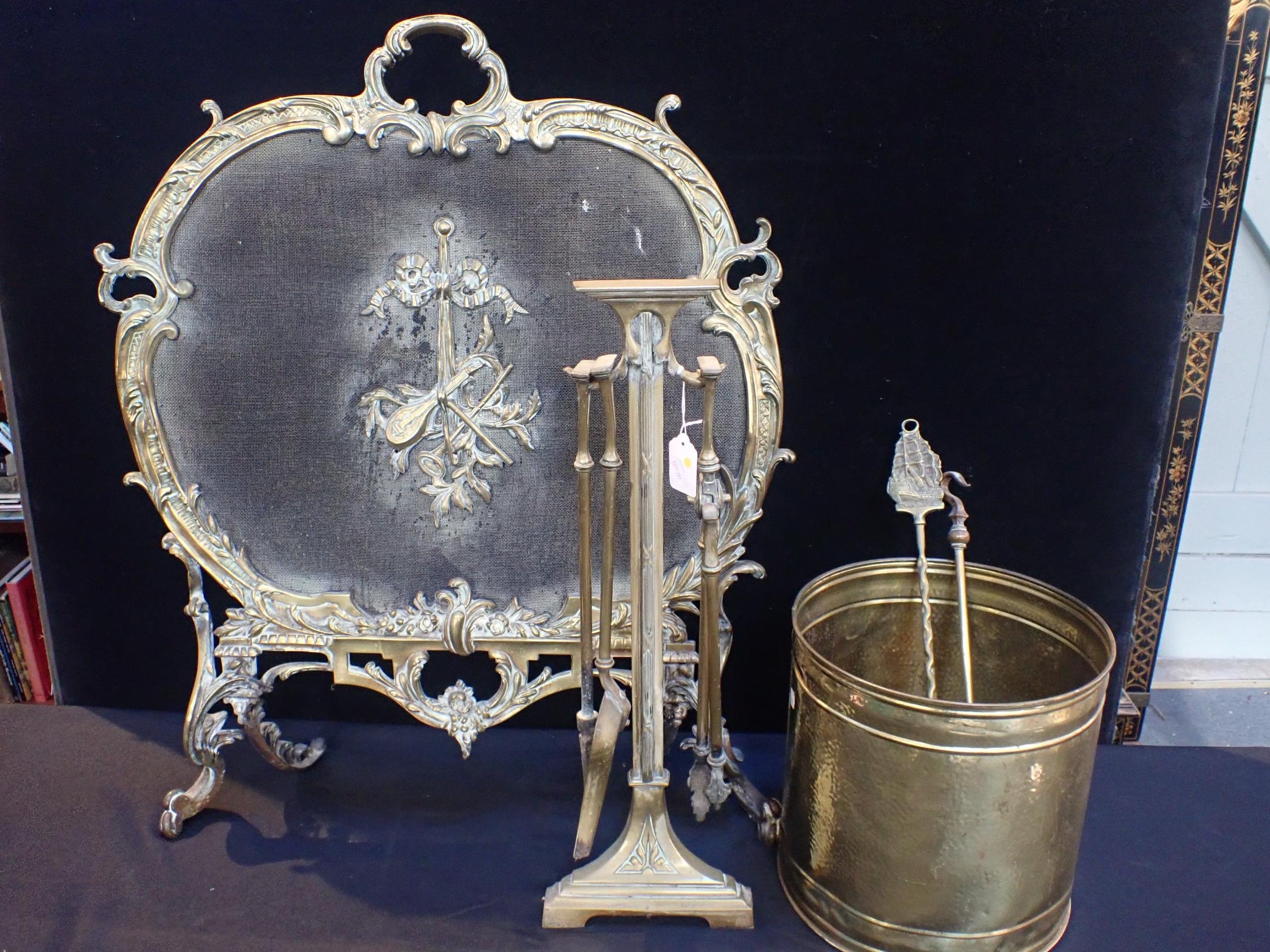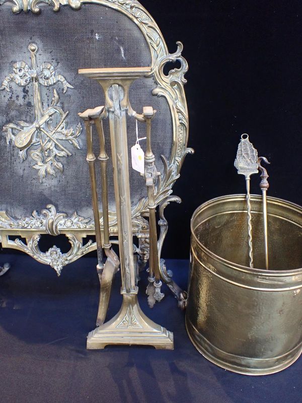 in a rococo style, 74cm high, with a set of brass fire irons and other brass wares