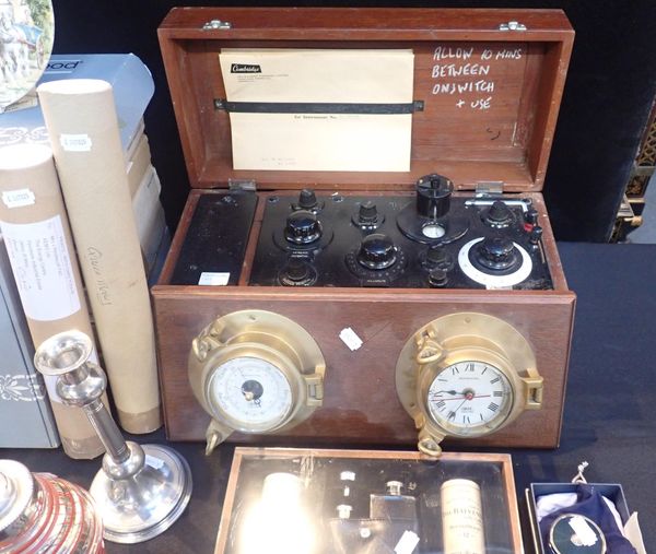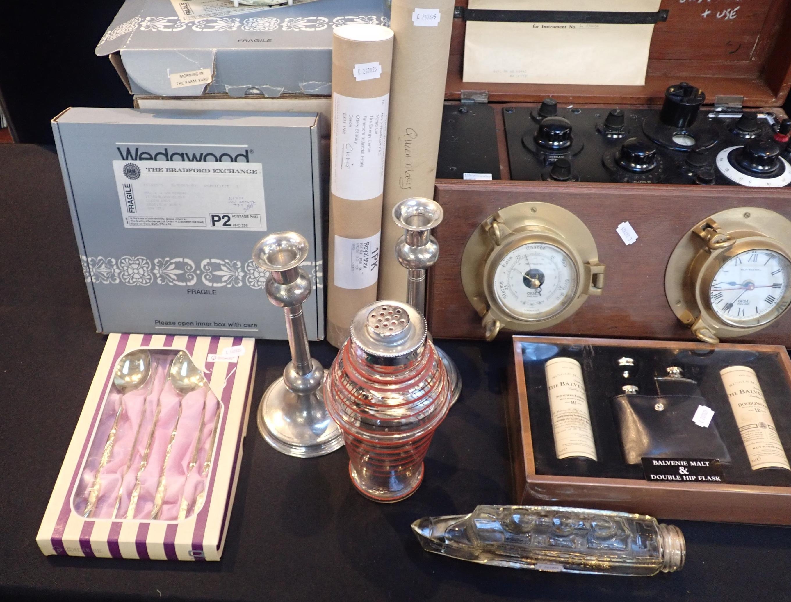 in teak case, 20cm high x 45cm wide x 20cm deep, a GRM brass twin clock and barometer set, mounted on mahogany panel, a Balvenie two miniature bottle gift set, a Queen Mary moulded clear glass flask, seven collectors wall plates and mixed other items (19)