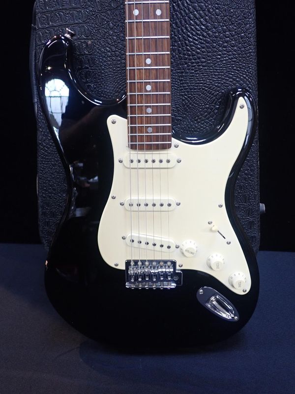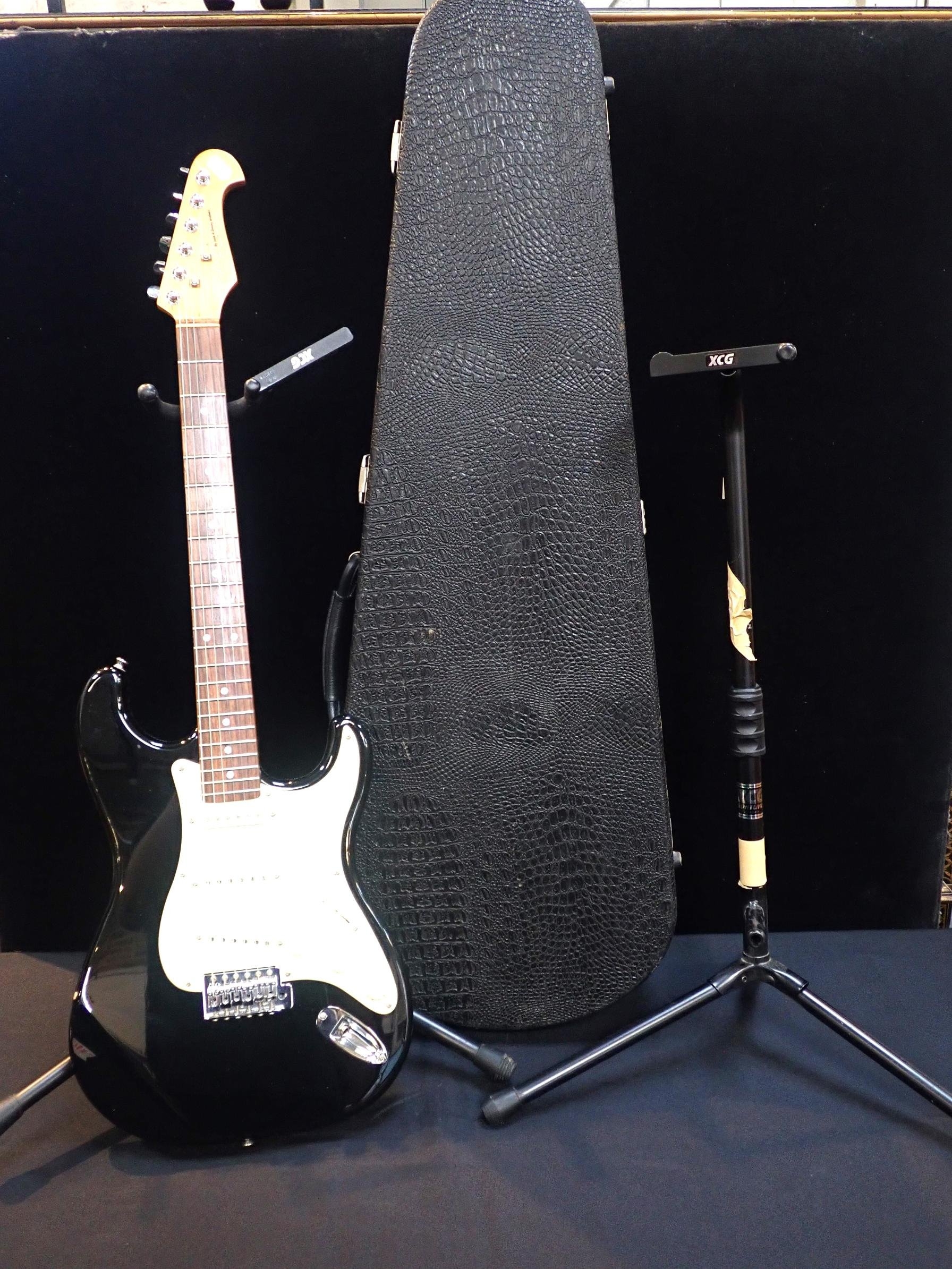 with strap, cased, together with two guitar stands (3)