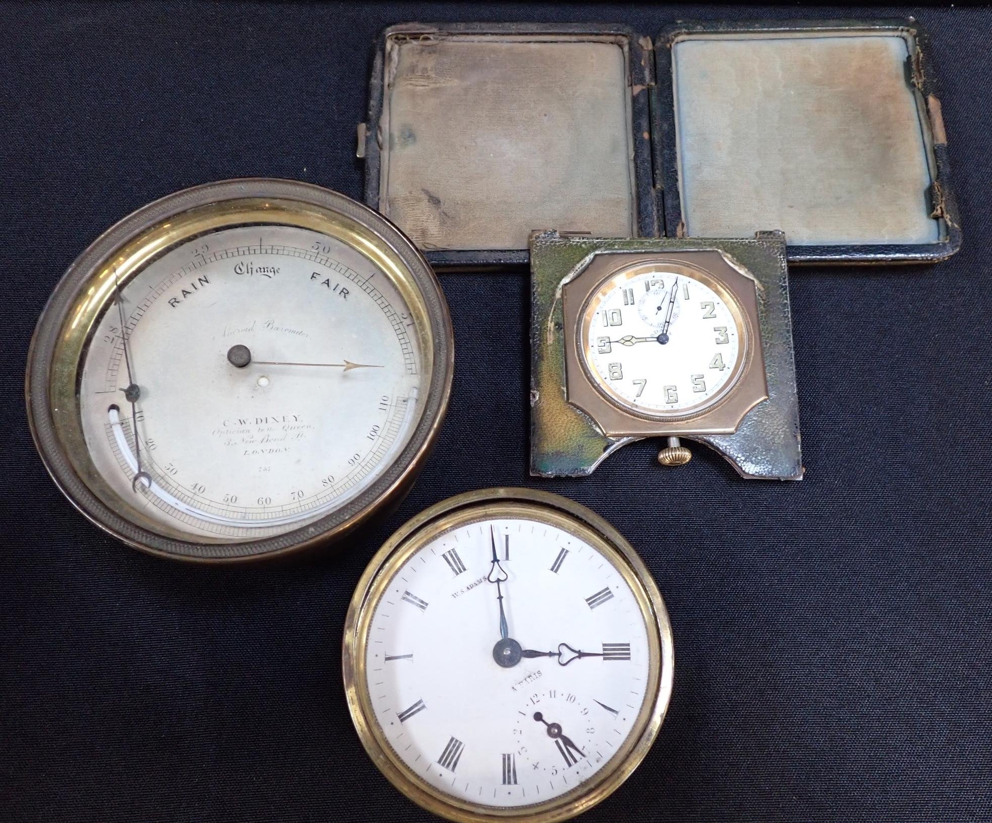 3 New Bond St, London (a/f), an alarm clock movement by W.S. Adams, Paris, and a leather-cased travel clock (a/f) (3)