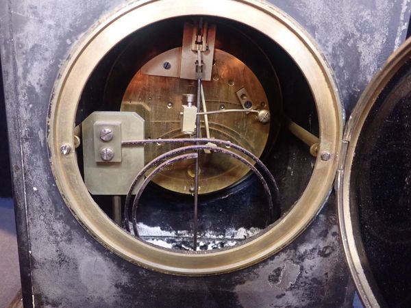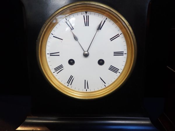 A 19th CENTURY BLACK SLATE CASED CLOCK