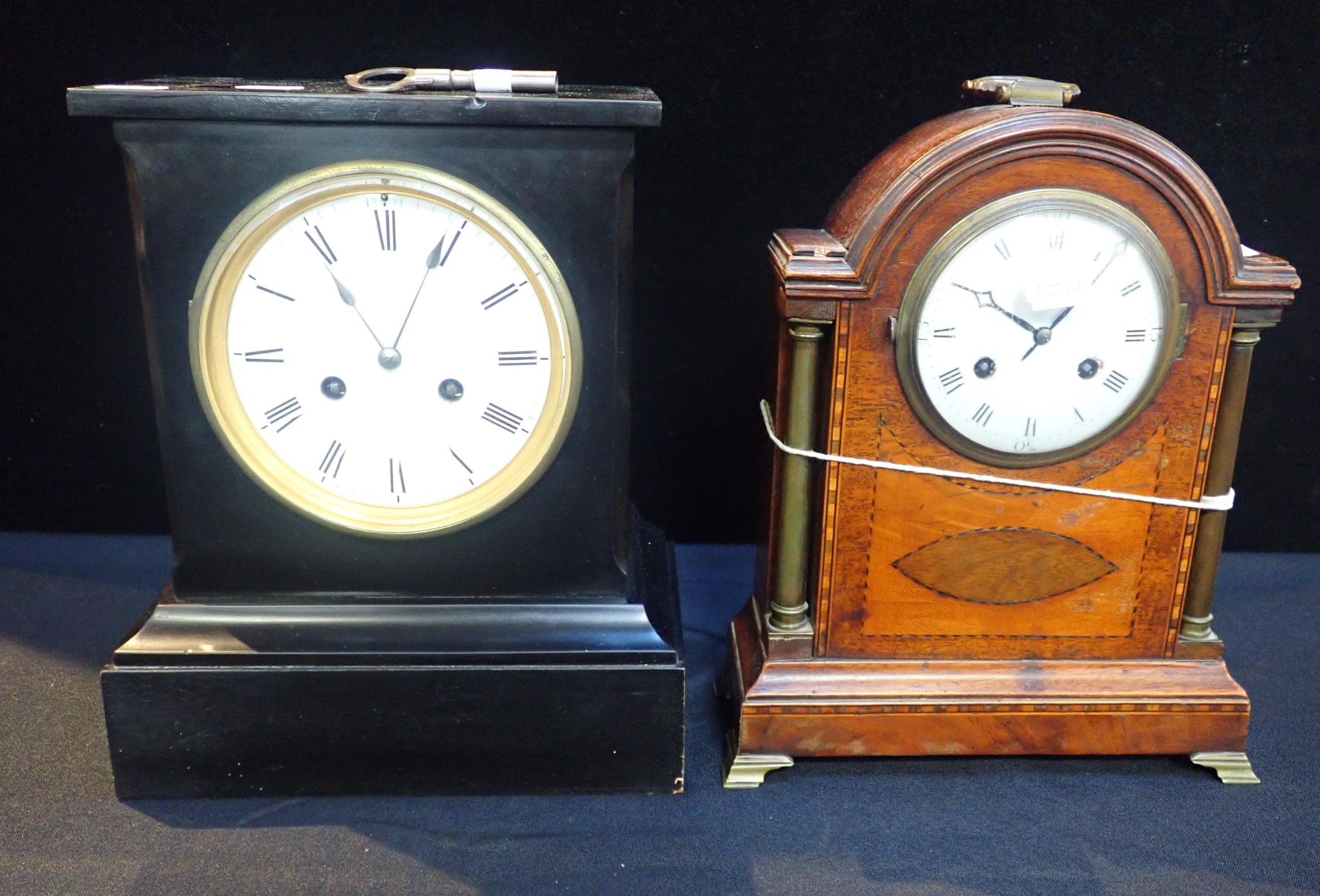 the French movement striking on a gong, with a wooden cased classical style clock with inlaid decoration, striking on a bell (both need work) (2)