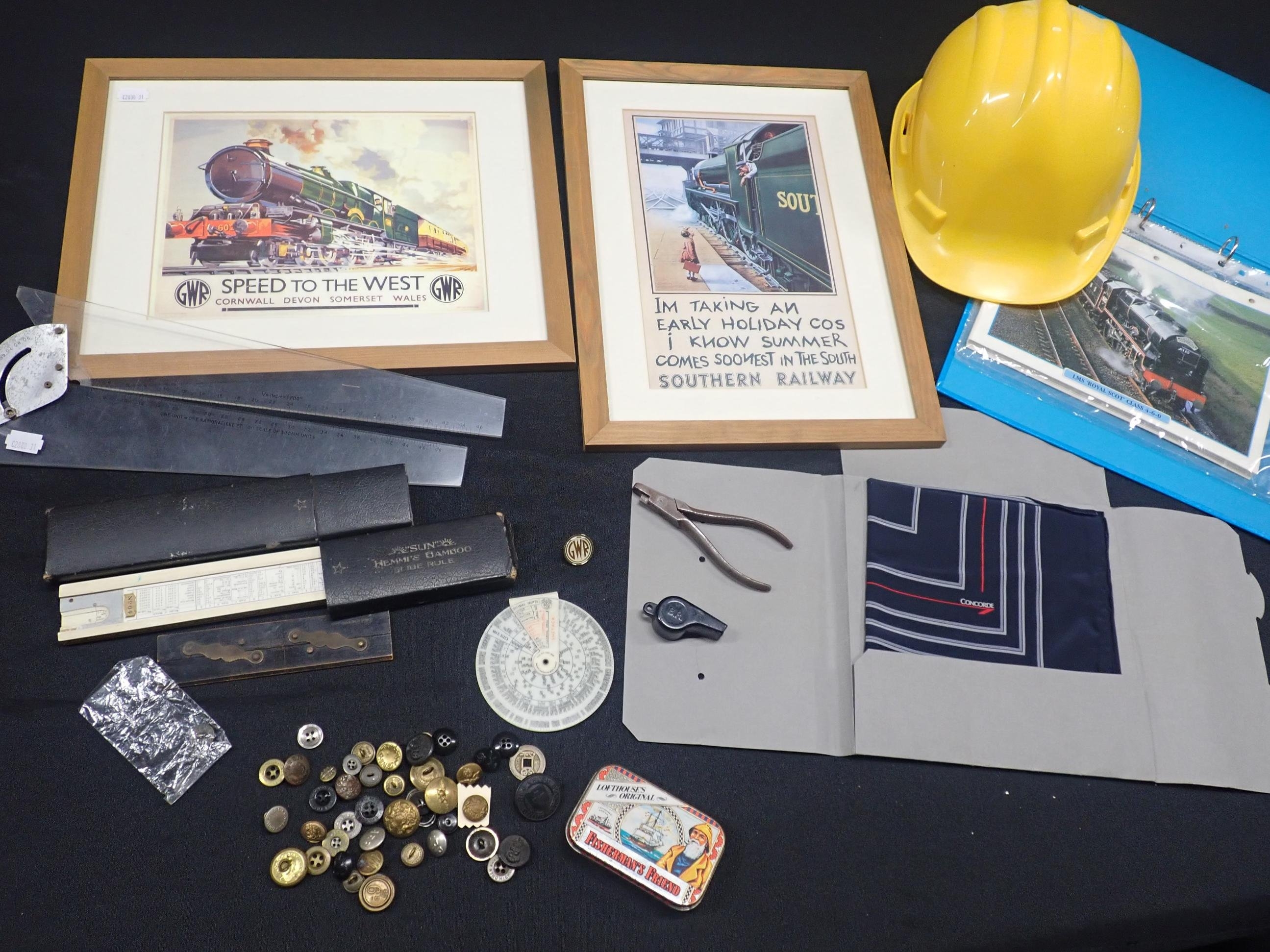 other railway items, a Concorde headscarf, military and other buttons, slide rule and other items
