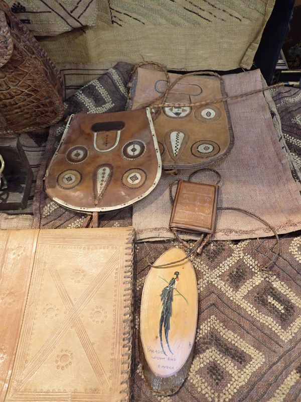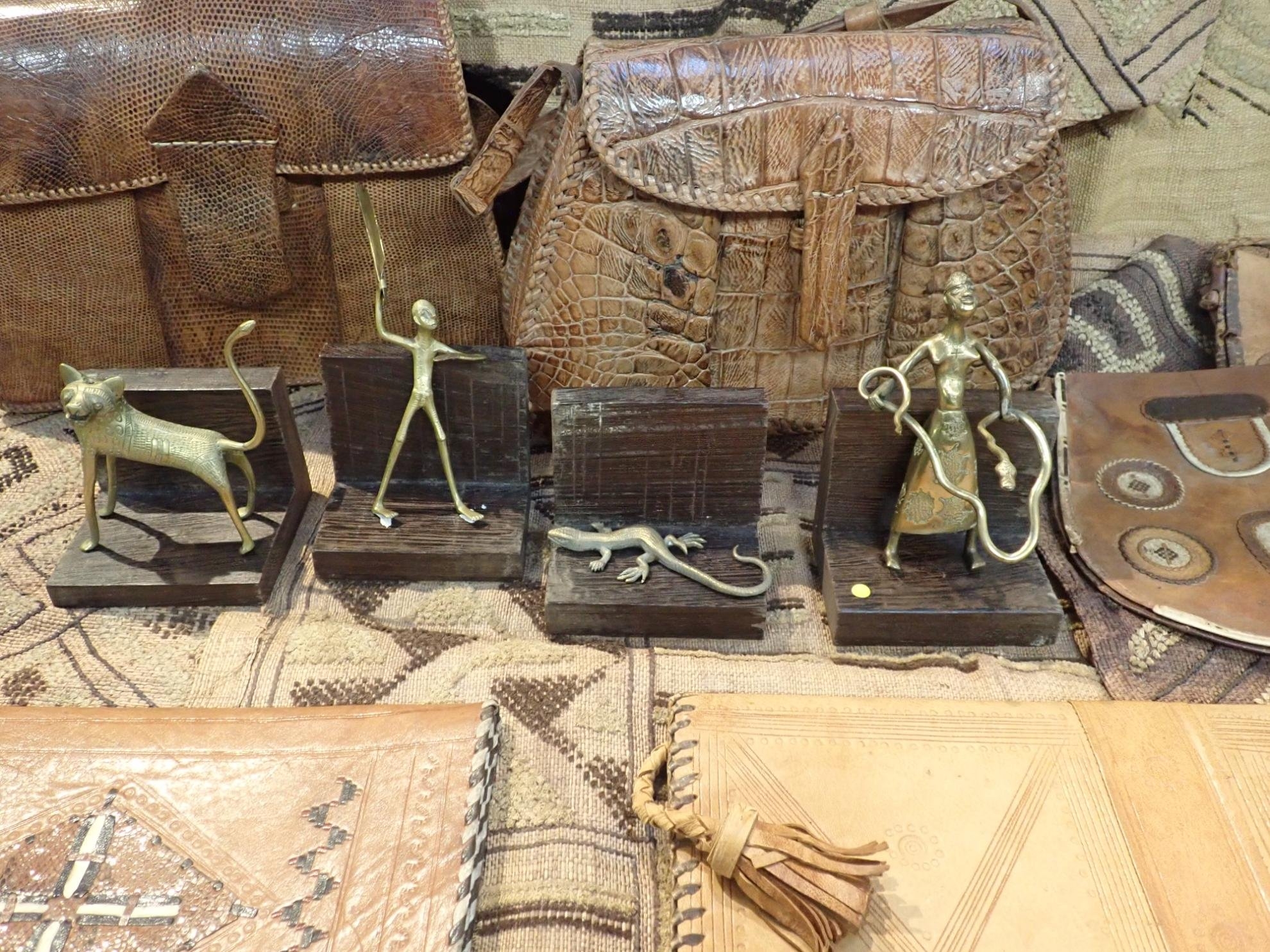 on hardwood stand, 16cm high, three similar brass figures of a man, a hyena and a lizard respectively, also with stands, two African crocodile leather handbags, five other African leather bags/purses, five African woven rush labels and a South African painted wooden panel (20)