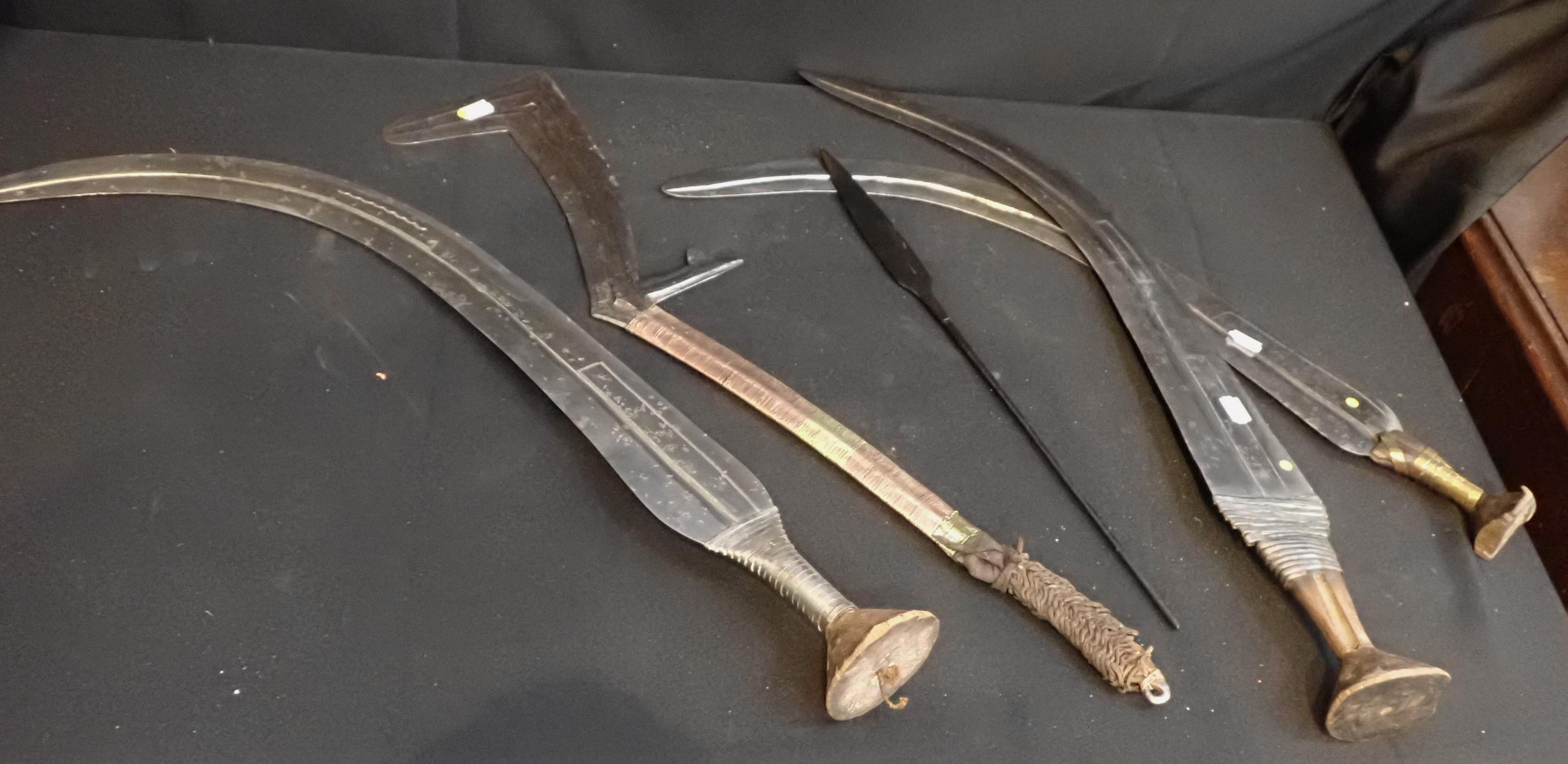 with metal hilt and wood pommel, 71cm long, two similar ditto curved swords and a similar African throwing knife with copper and fabric bound hilt, 69cm long (4)