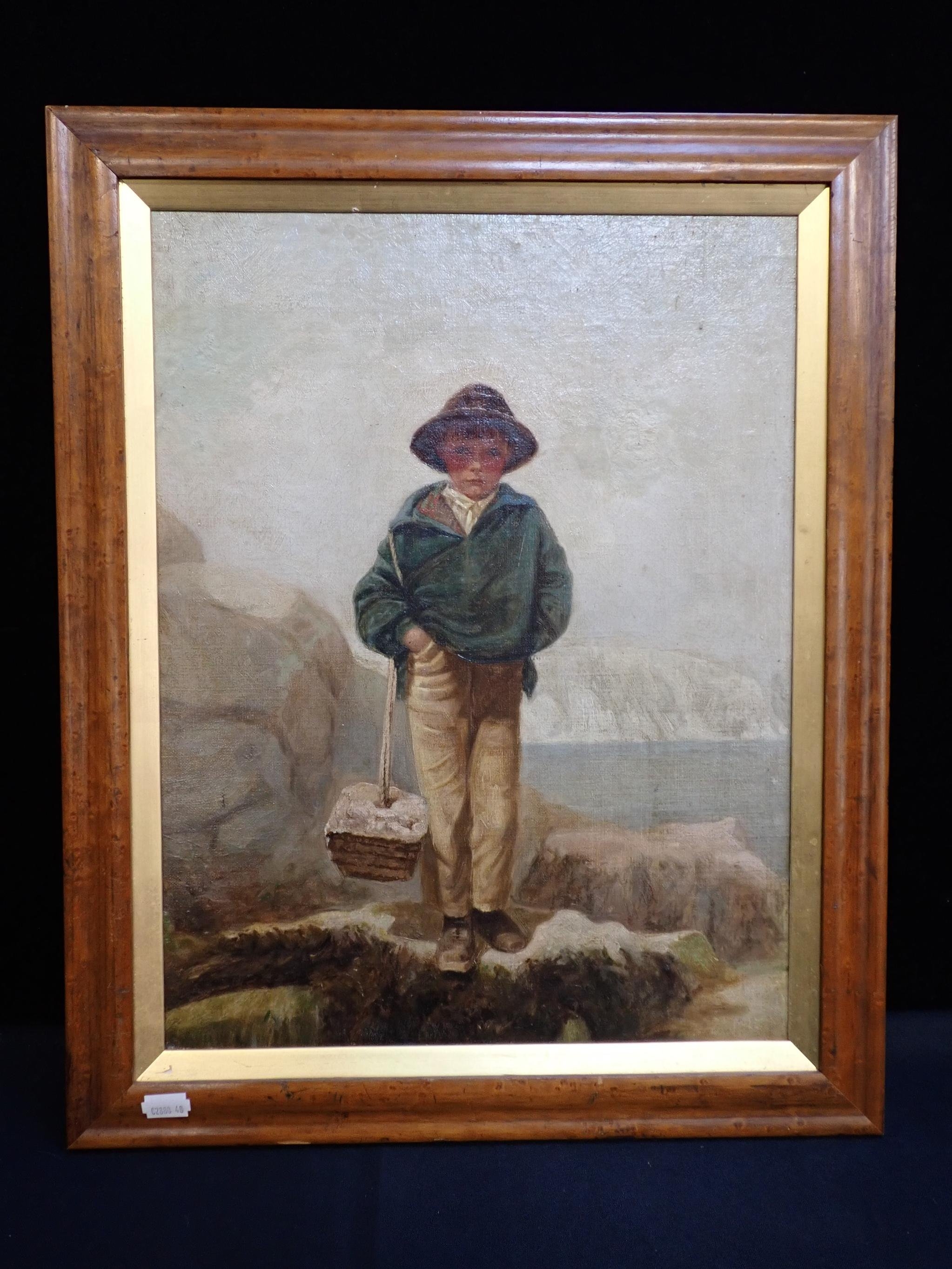standing on rocks with basket, oil on canvas board, in a maple frame 53.5 x 43.5cm