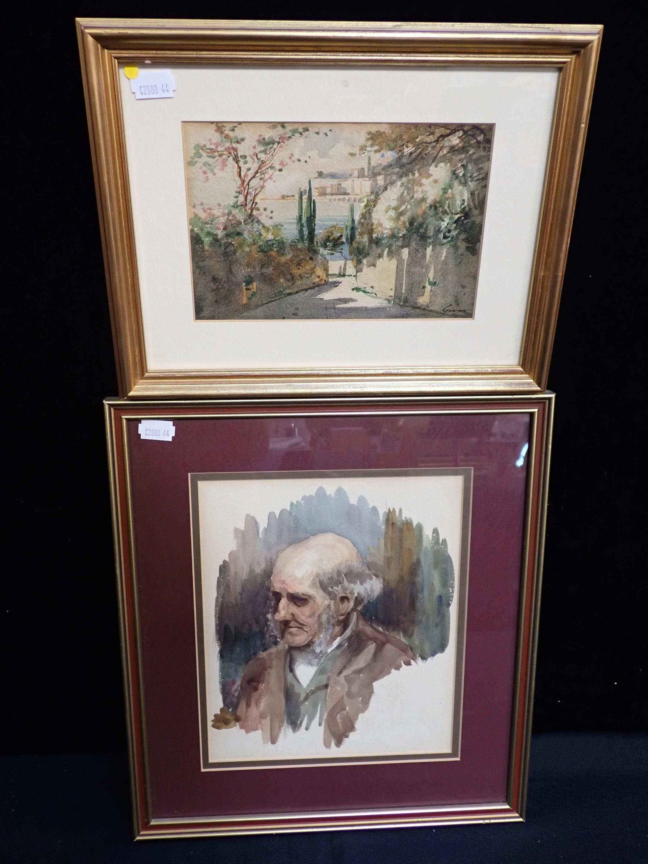 watercolour, framed 23 x 29.5cm, and a watercolour portrait of an old man 35 x 31cm (2)