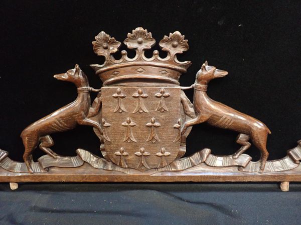including an heraldic crest piece with shield and supporting hounds 32 x116cm