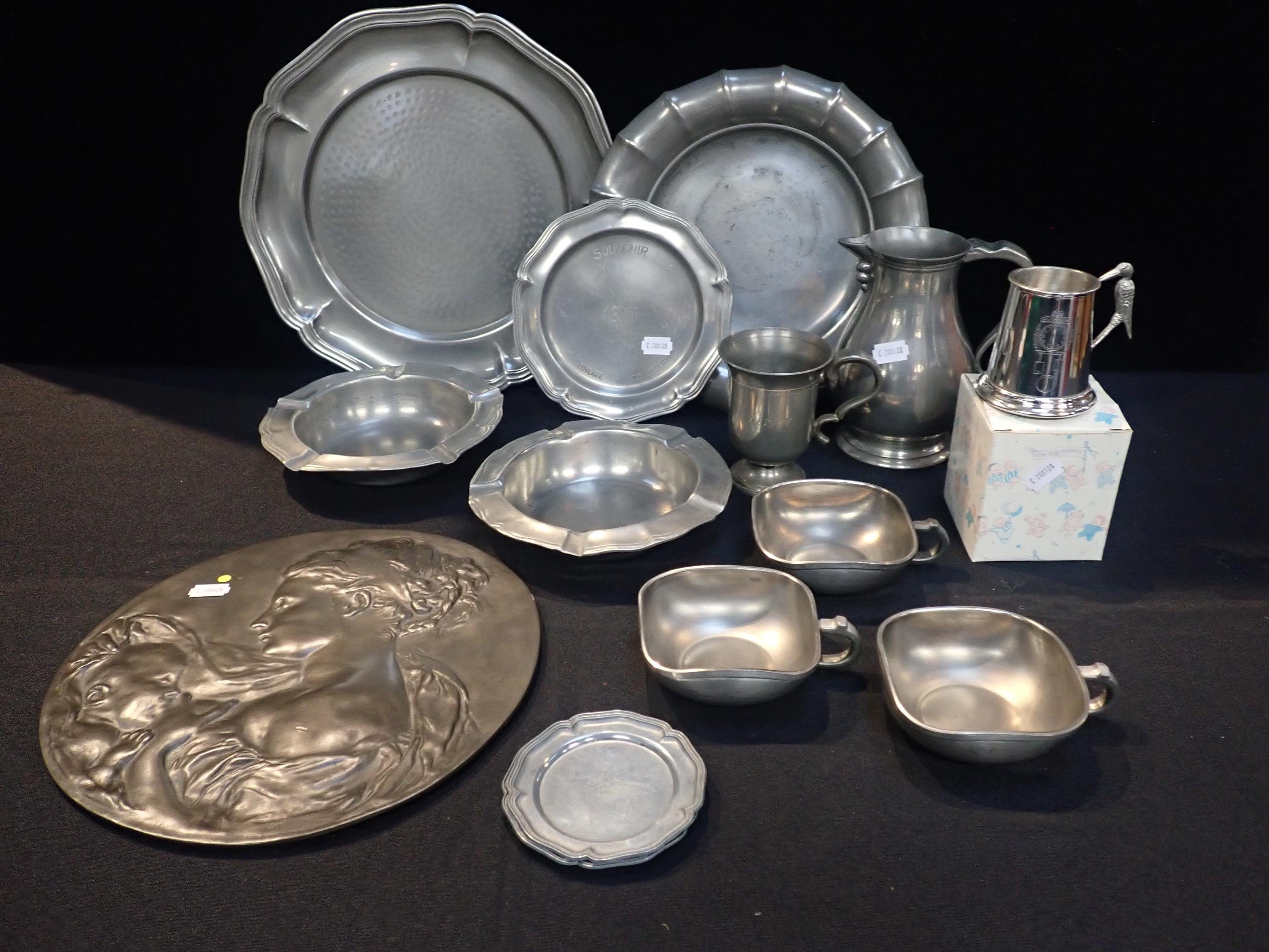 embossed in relief with a Mother and Child, 27.5cm diameter and thirteen other pewter items (14)