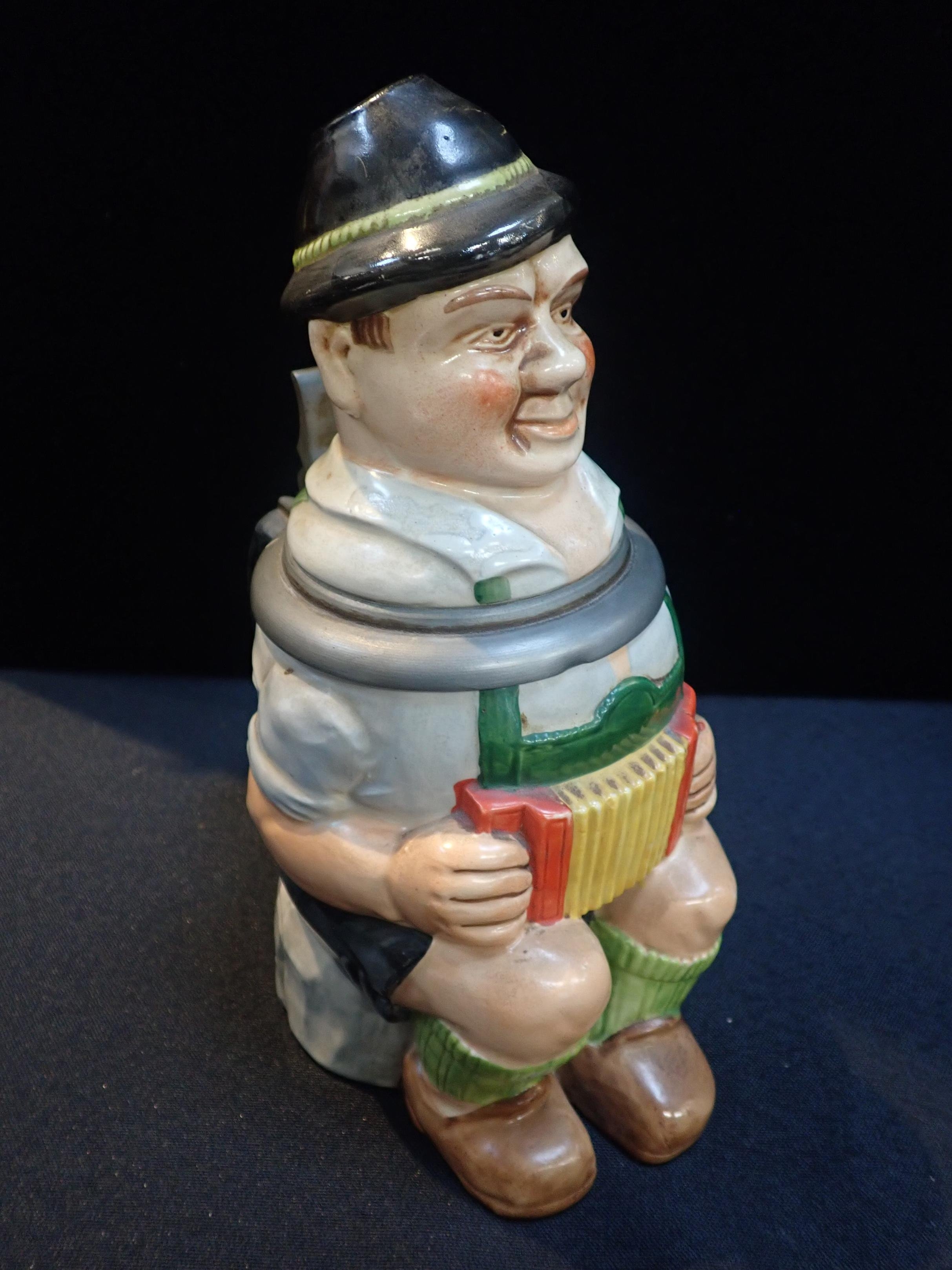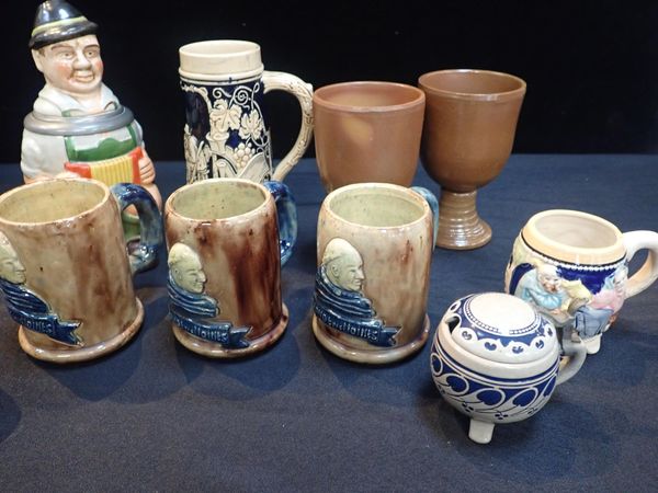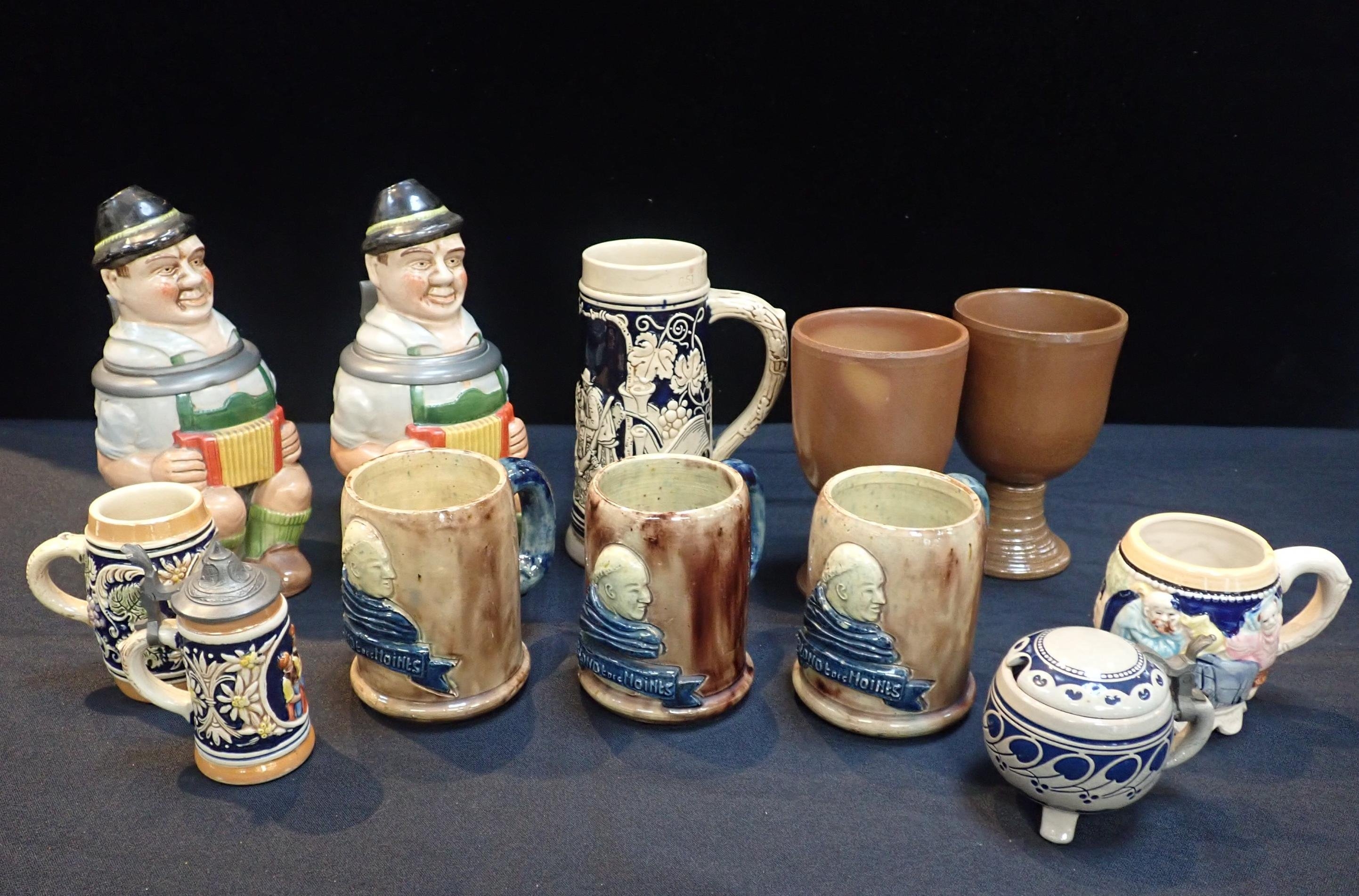 modelled as seated accordeonists wearing lederhosen, each 23cm high, eight other steins/tankards and a pair of stoneware goblets (13)