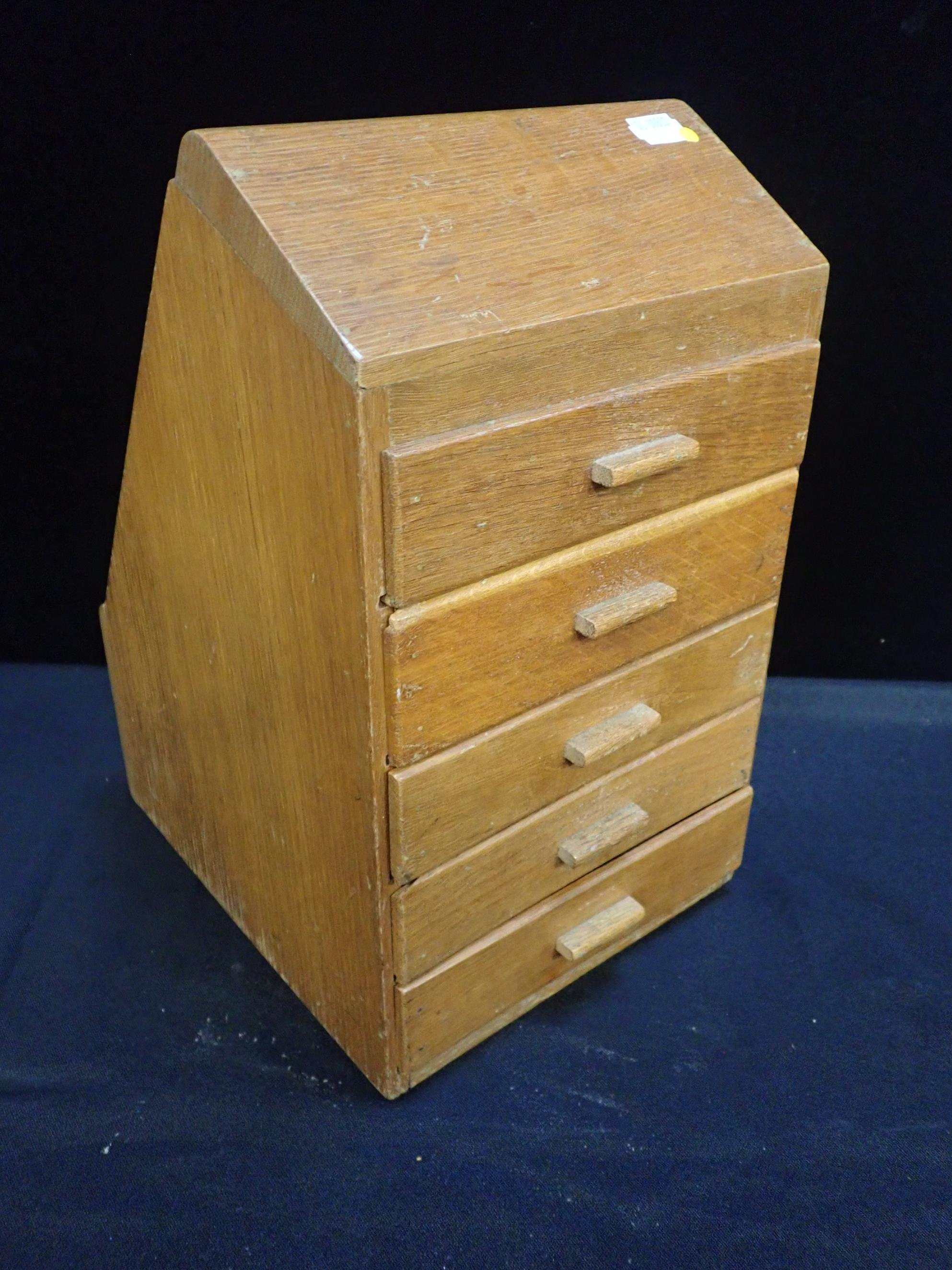 with mirrored sloping front, and five drawers, 32cm high, 19.5cm wide